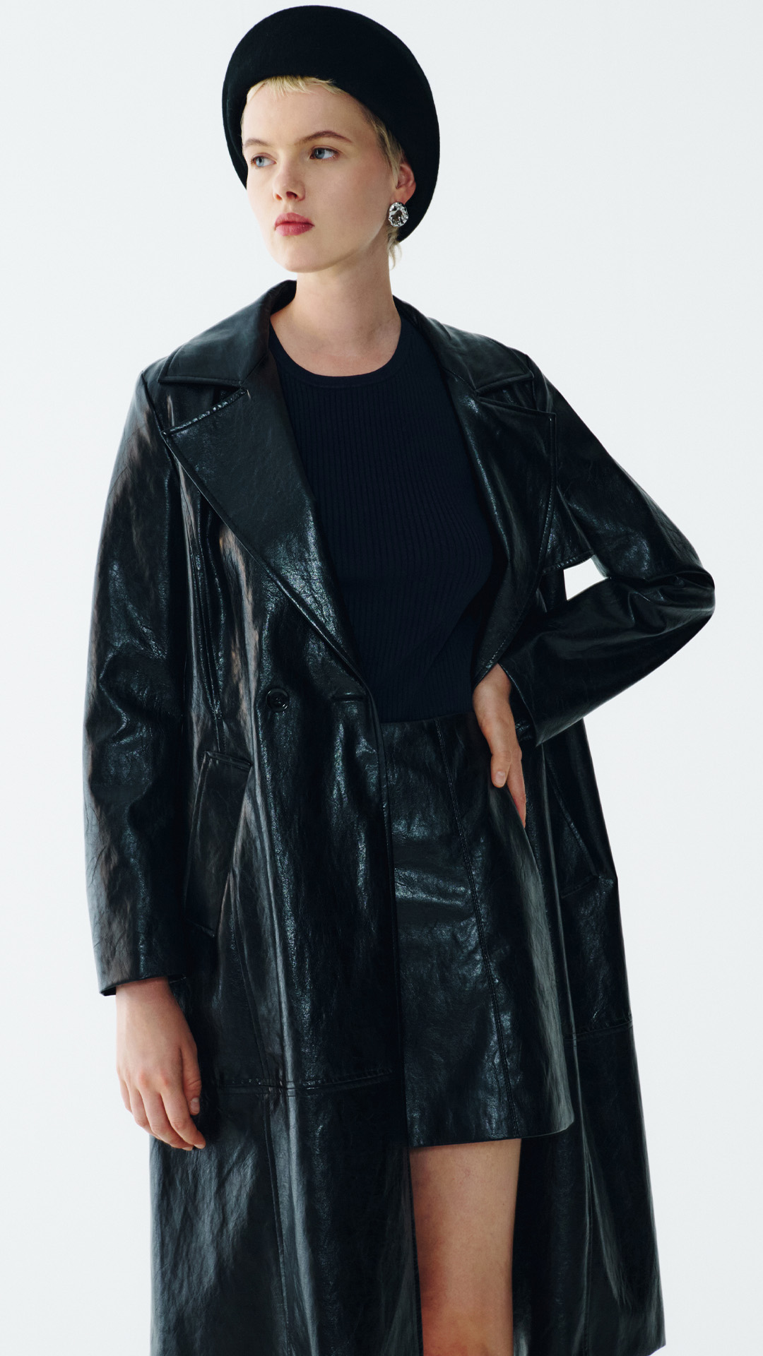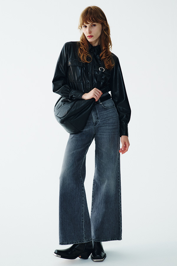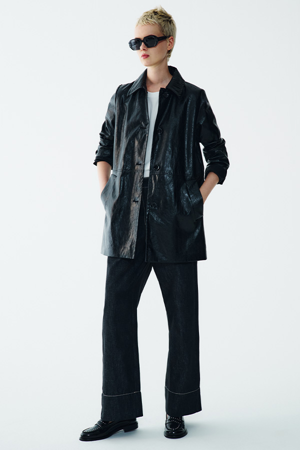 La pelle incontra il denim e lo fa con la stessa energia dei 90’s vibes. Giacche over, jeans a gamba larga e silhouette essenziali che richiamano il minimalismo di quell’epoca.