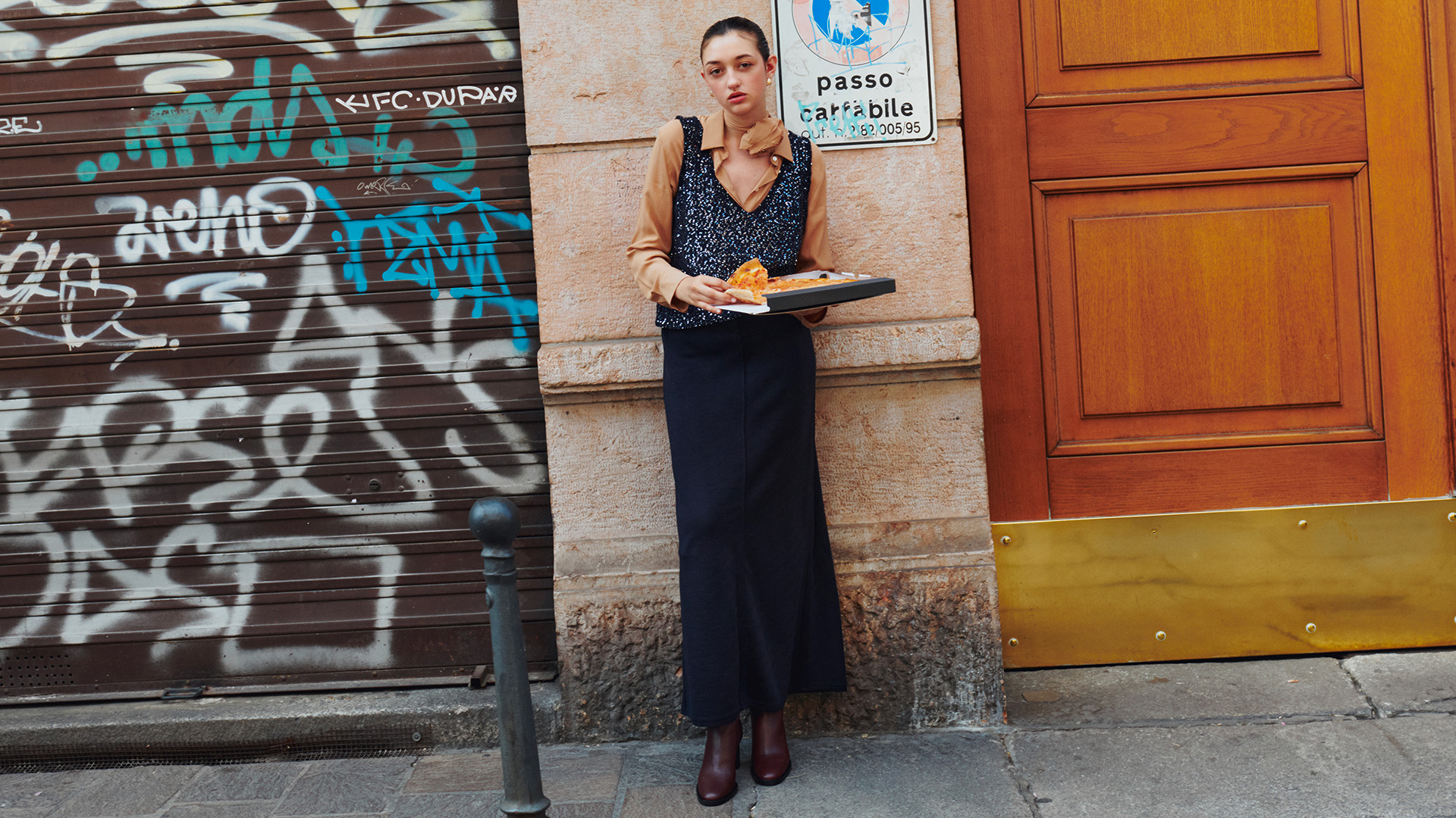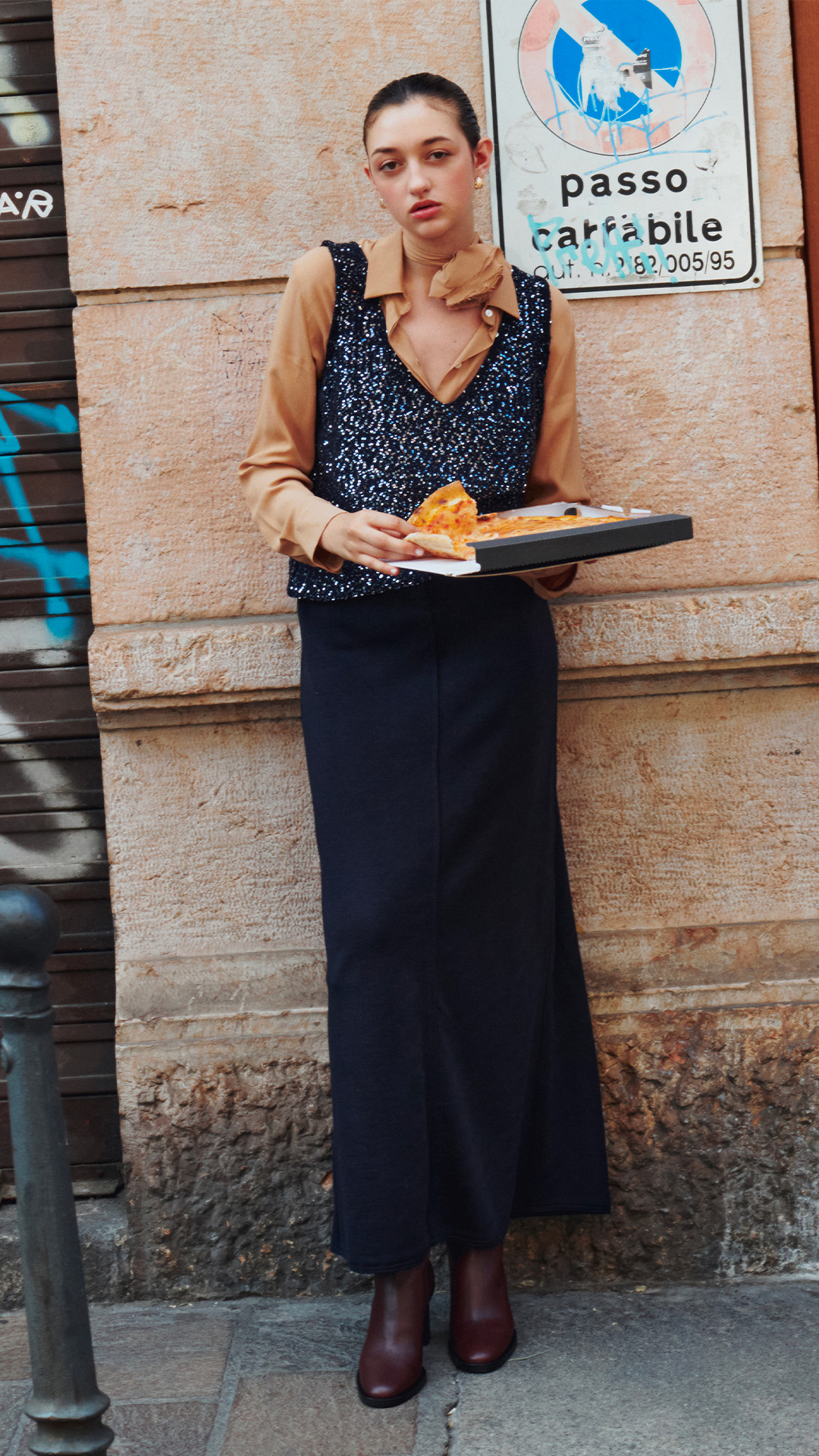 Abbinali di giorno a maglioni maxi a fantasia, mentre per la sera indossa una maxi gonna impreziosita da un gilet in pailettes per un look comfy ma sofisticato.