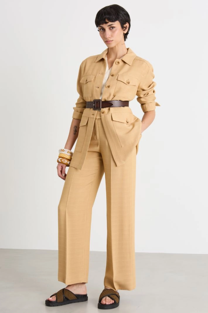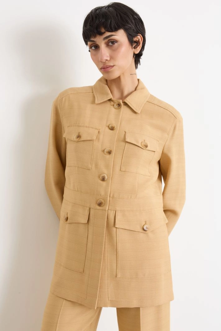 Sahariana dalla linea dritta in viscosa fluido, con colletto a punta, maniche lunghe, tasche multiple con patta e bottone. Chiusura con bottoni.