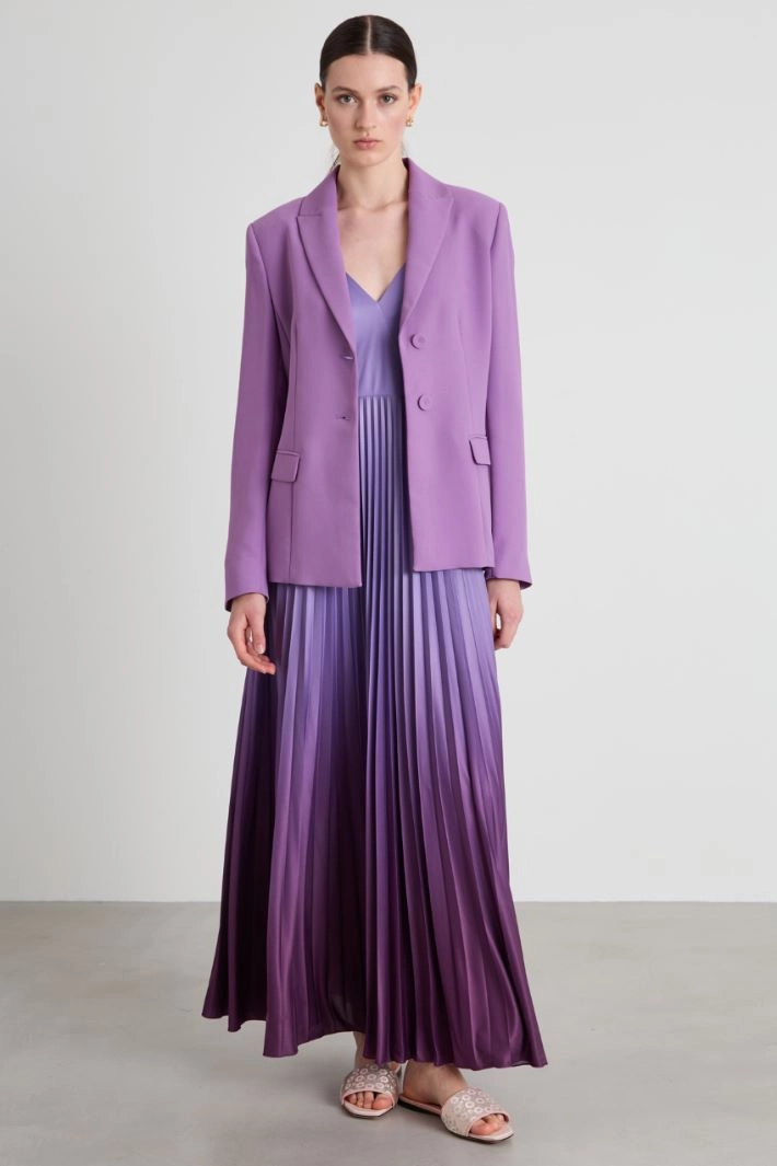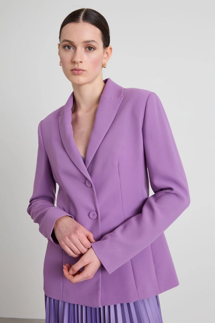 Blazer dalla linea sfiancata realizzato in enver satin, con collo a rever a lancia, maniche lunghe, tasche laterali a doppio filetto con patta e allacciatura monopetto tramite bottoni ricoperti. Capo foderato.