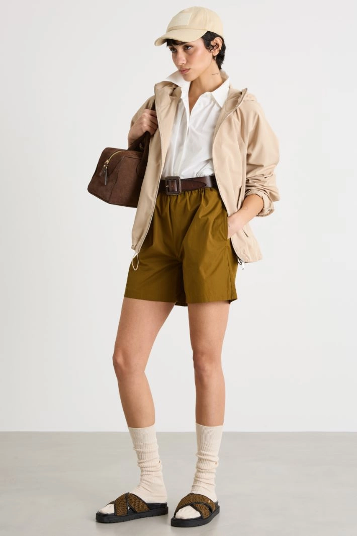 Giacca dalla linea dritta in tessuto antigoccia, con collo alto e cappuccio, maniche lunghe, tasche laterali con patta. Capo sfoderato. Chiusura con zip.