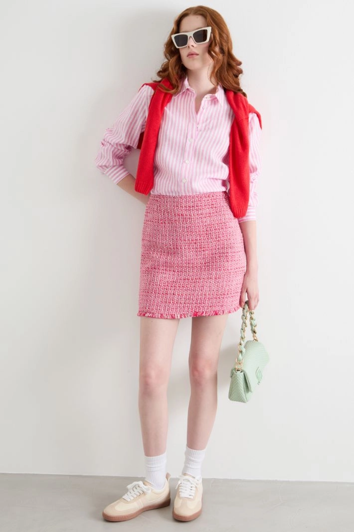 Tessuto 83% cotone, 12% poliestere, 2% fibra metallica, 2% altre fibre, 1% fibra metallizzata; fodera 62% acetato, 38% poliestere.