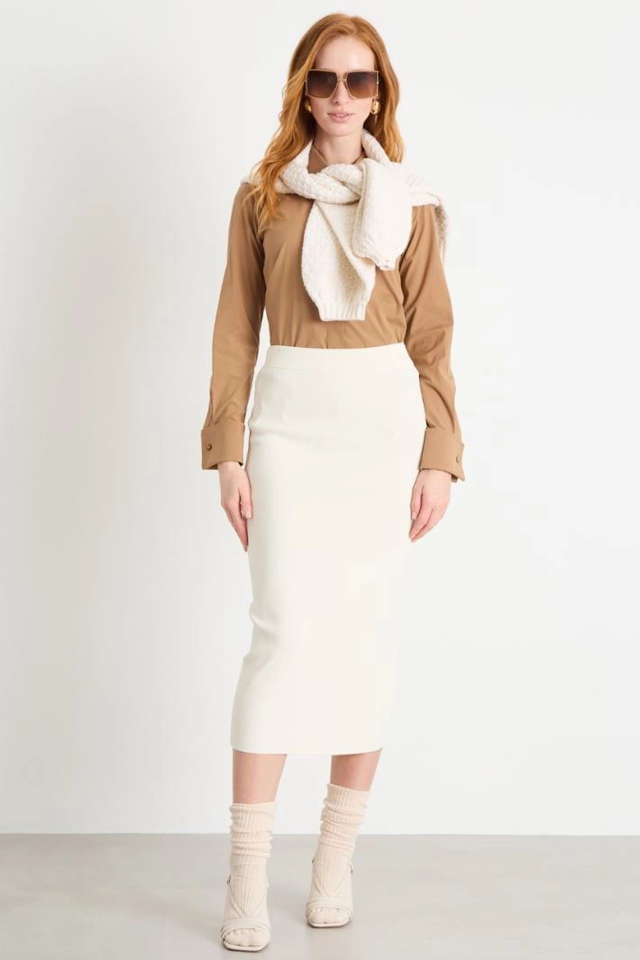 Camicia dalla linea dritta in popeline di cotone stretch, con colletto a punta e maniche lunghe con polsino alto a gemello. Chiusura con bottoni.