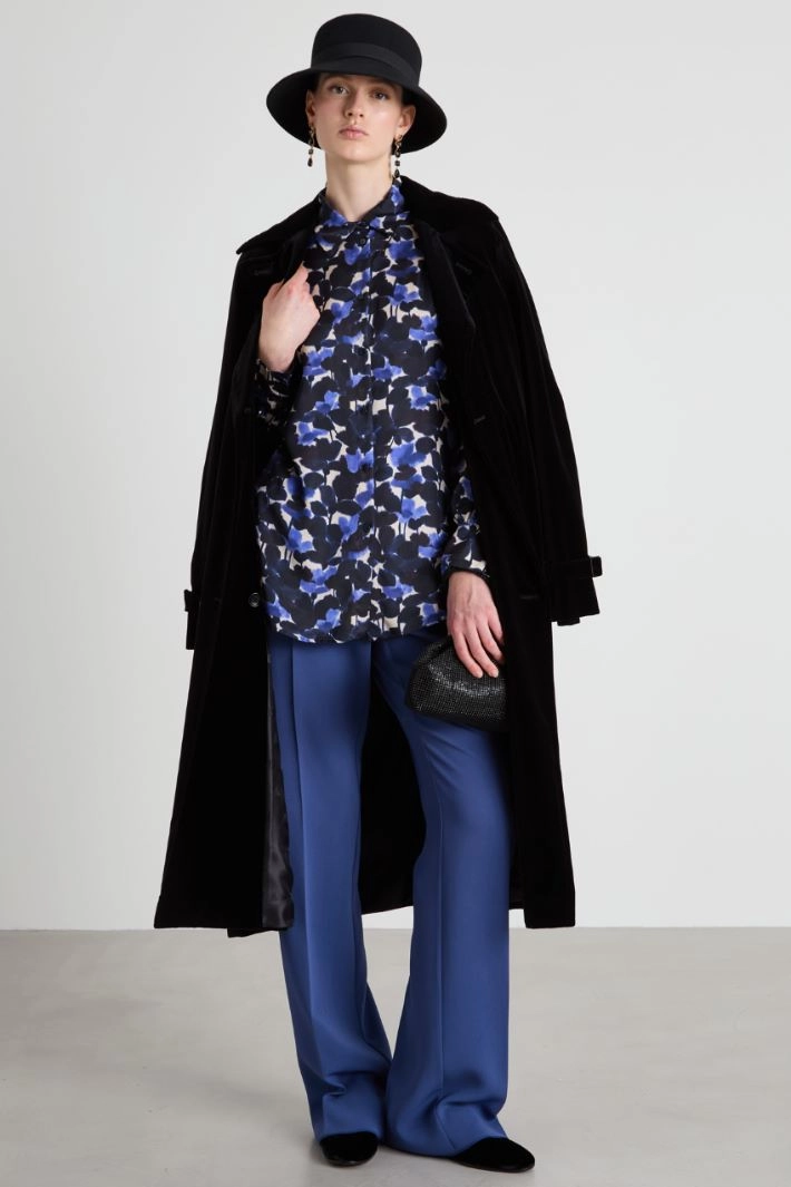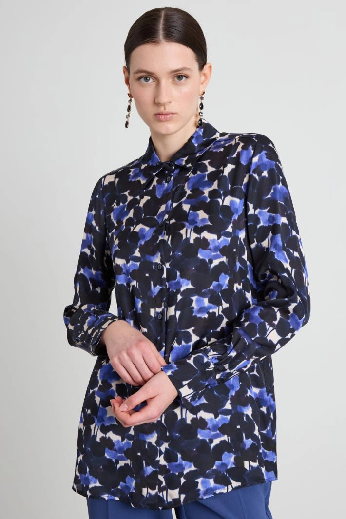 Camicia dalla linea dritta realizzata in raso di viscosa, con colletto classico e maniche lunghe con polsino e bottone. Allacciatura tramite bottoni.
