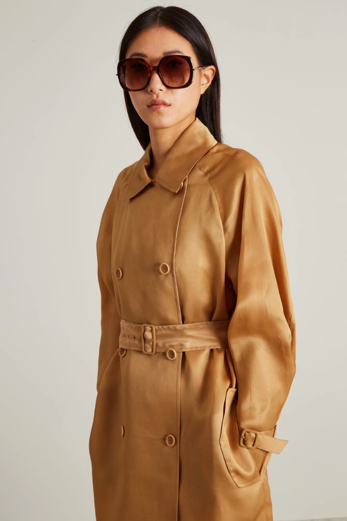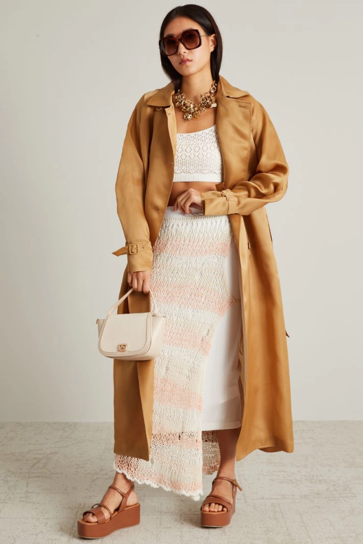 Spolverino stile trench realizzato in organza di pura seta, con colletto a camicia, maniche lunghe raglan con alamari al polso, tasche laterali inserite in cucitura con finta patta e dettaglio di contropiego nel retro. Allacciatura doppiopetto tramite bottoni e cintura coordinata in abbinamento. Capo sfoderato.