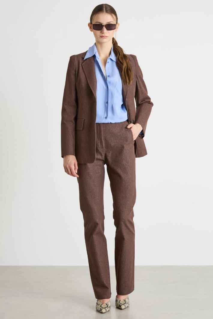 Pantalone dalla linea dritta in puro cotone effetto jeans, con piega stirata, tasche alla francese sul davanti, tasche a filetto con bottone sul retro. Chiusura con zip e gancio.