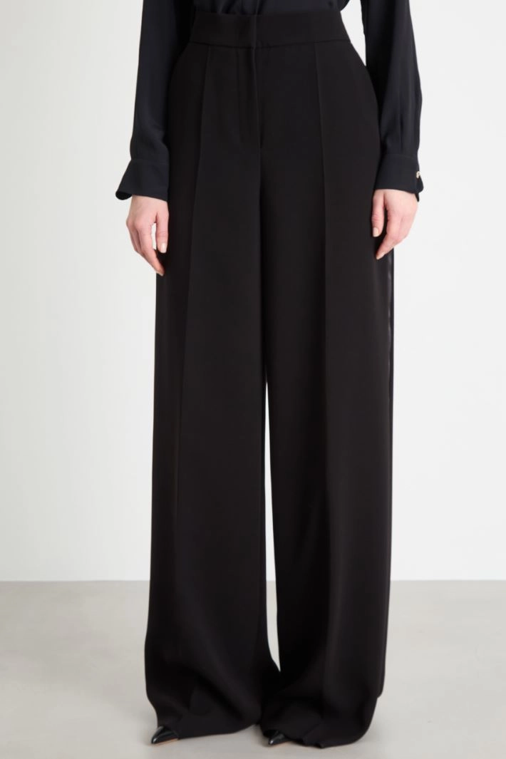 Pantalone palazzo in cady leggero, con tasche alla francese sul davanti, piega stirata e tasche a filetto sul retro. Chiusura con zip e gancio.