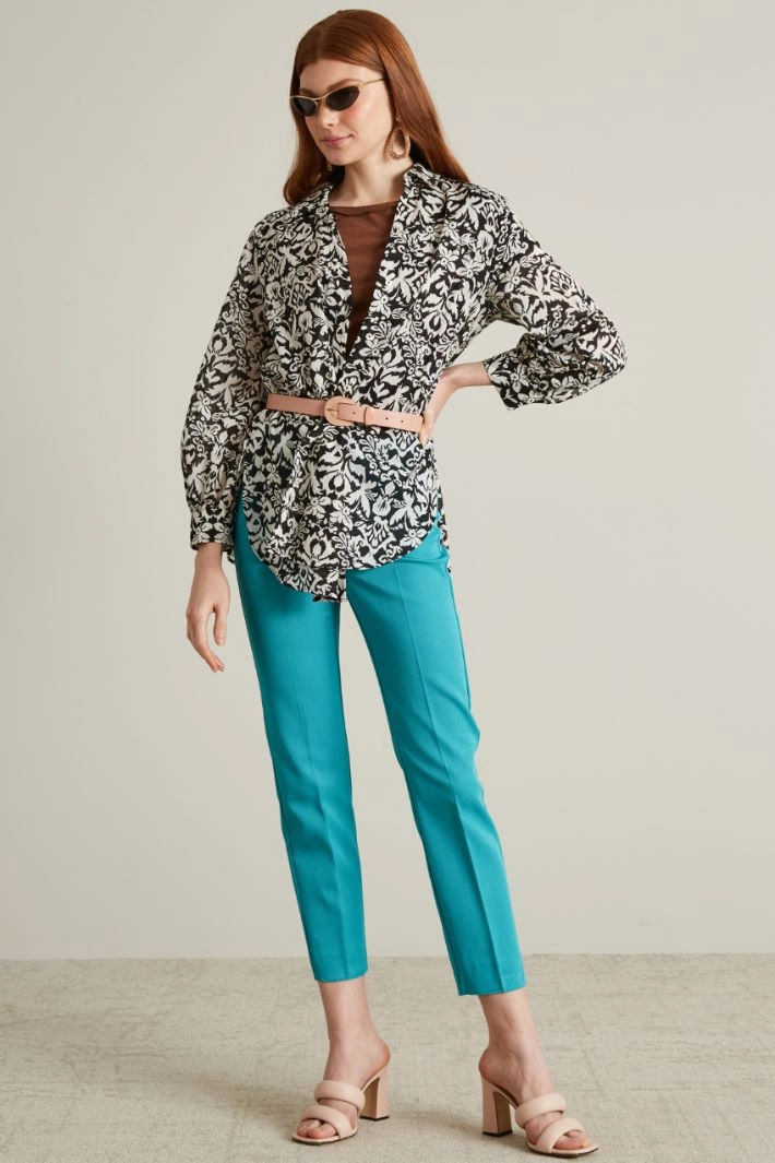Pantaloni a sigaretta realizzati in faille di misto cotone stretch, con piega stirata in lunghezza e allacciatura tramite zip nascosta e bottone rivestito.