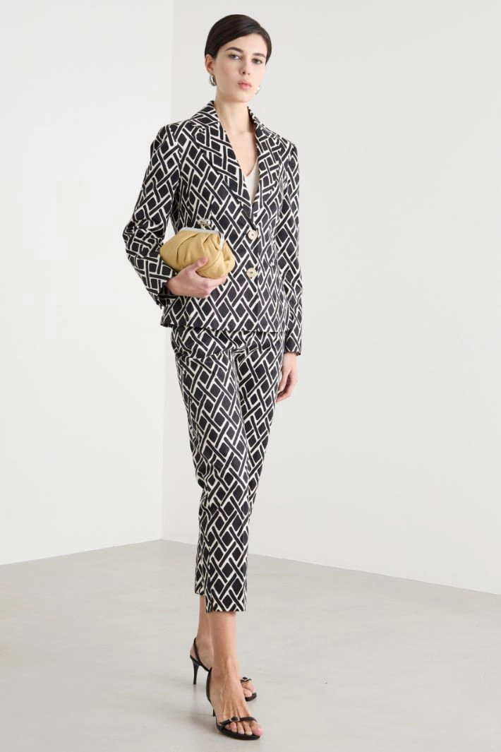 Pantalone dalla linea a sigaretta in raso di cotone stretch con passanti in vita, tasche alla francese sul davanti, tasche a filetto sul retro, spacchi al fondo. Chiusura con gancio e zip nascosta.