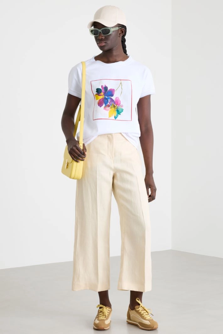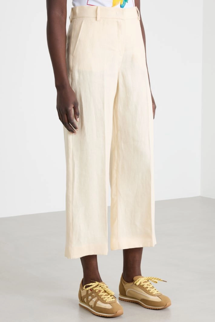 Pantalone dalla linea ampia in gabardina di lino con passanti in vita, tasche alla francese sul davanti e filetto con bottone nel retro, piega stirata in lunghezza. Allacciatura nascosta tramite zip bottone e gancio.
