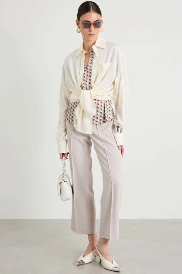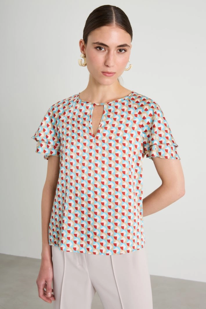 Blusa dalla linea dritta realizzata in twill, con scollo arrotondato, dettaglio cut-out e maniche raglan ondulate.