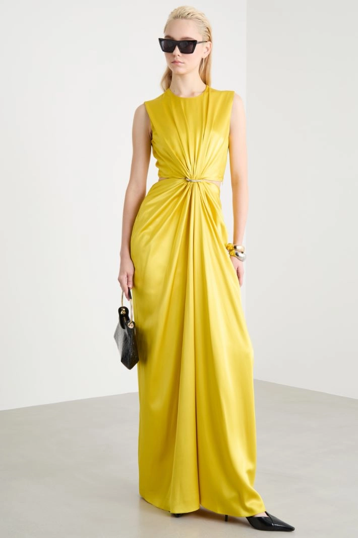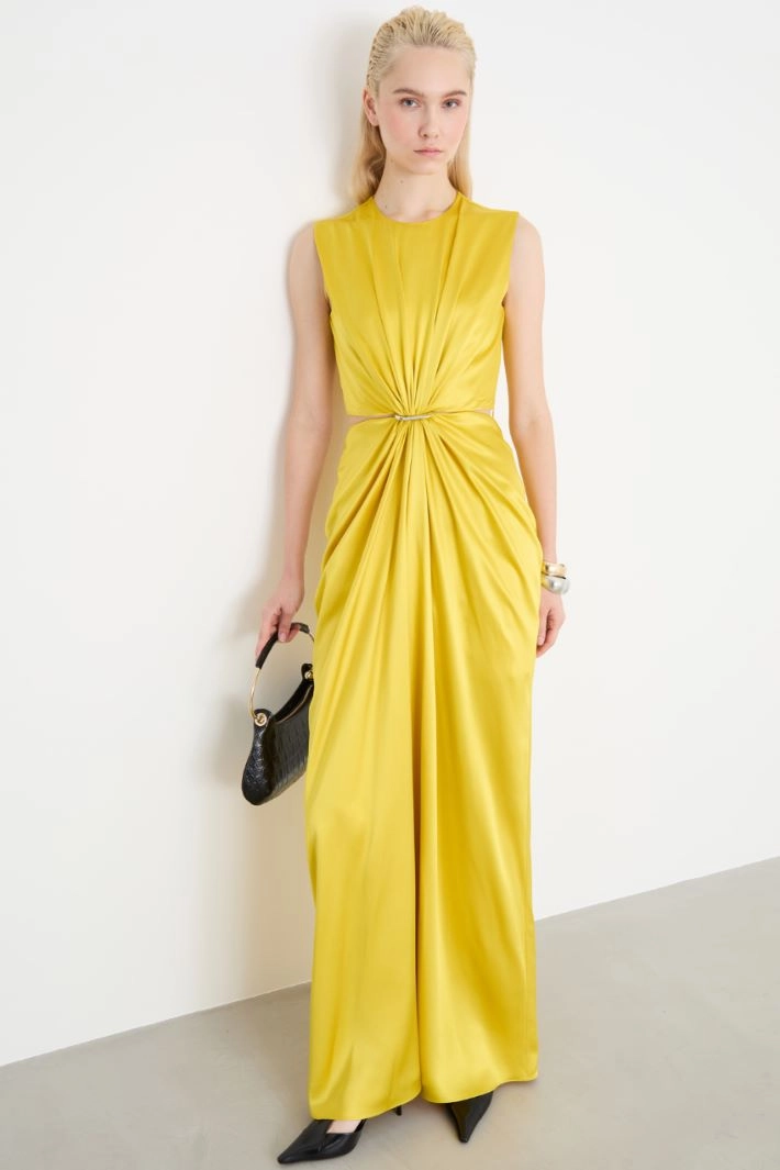 Abito lungo dalla linea aderente in raso di pura seta, con scollo tondo, motivo drappeggiato sul davanti con anello in metallo posizionato al centro, dettaglio cut-out sui lati e sul retro. Capo semifoderato. Chiusura a goccia con bottone sul retro, zip laterale e zip sul retro della gonna.