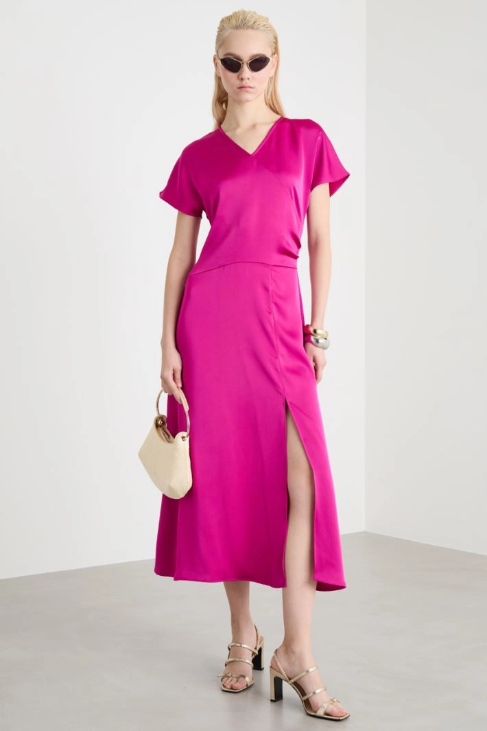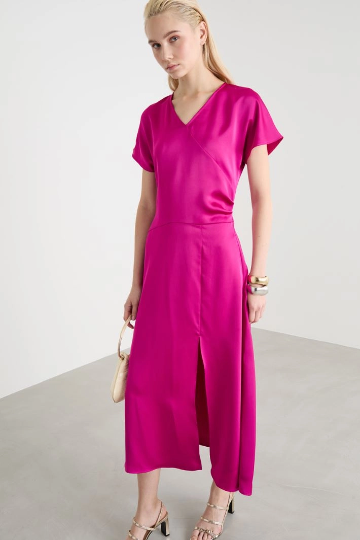Abito midi dalla linea scivolata in raso fluido, con scollo a V, maniche corte a kimono, drappeggio asimmetrico e taglio diagonale in vita, gonna svasata con spacco laterale.