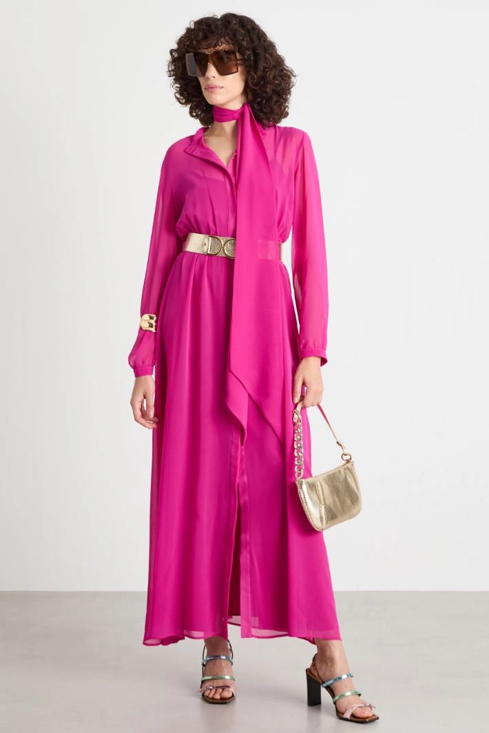 Abito chemisier dalla linea morbida in georgette, con scollo tondo, maniche lunghe, inserto elastico sul retro, tasche inserite in cucitura. Chiusura con bottoni e cintura.