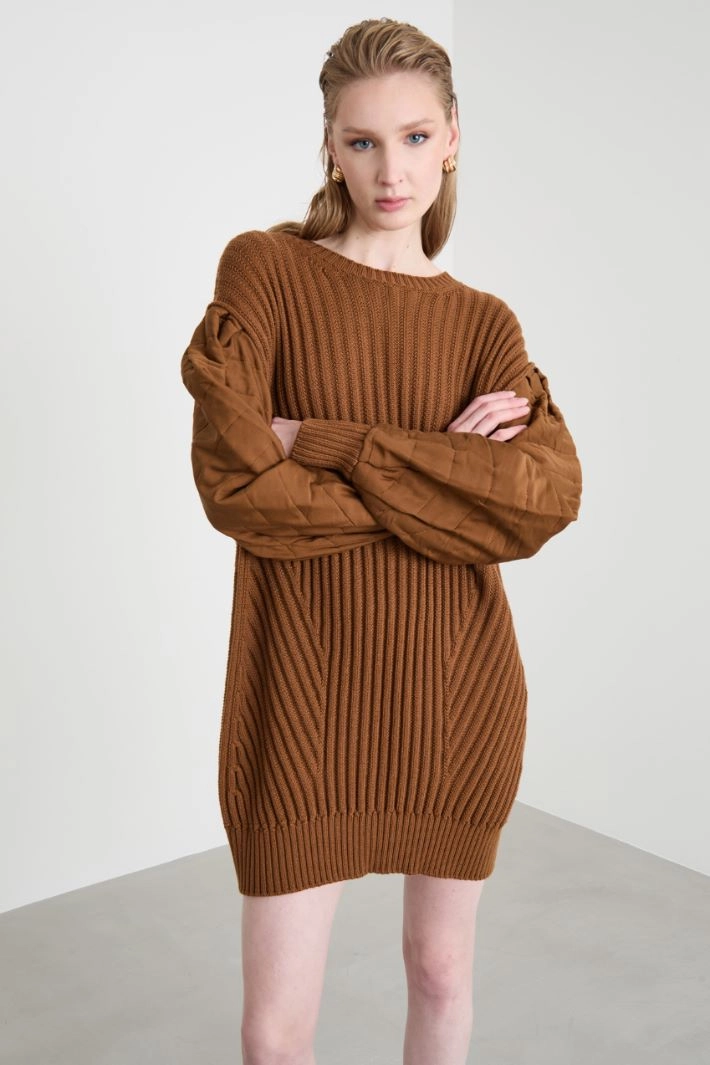 Abito corto dalla linea dritta in filato di pura lana lavorato a coste piatte, scollo tondo, maniche lunghe trapuntate in charmeuse pesante di pura seta. Profili a costine.