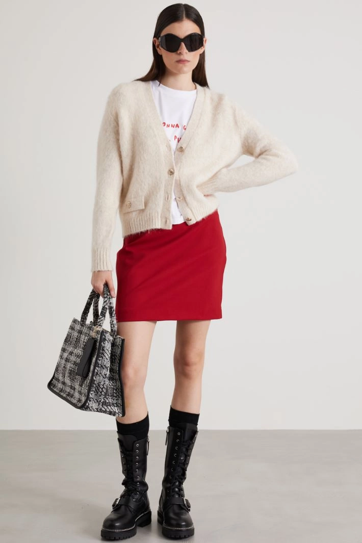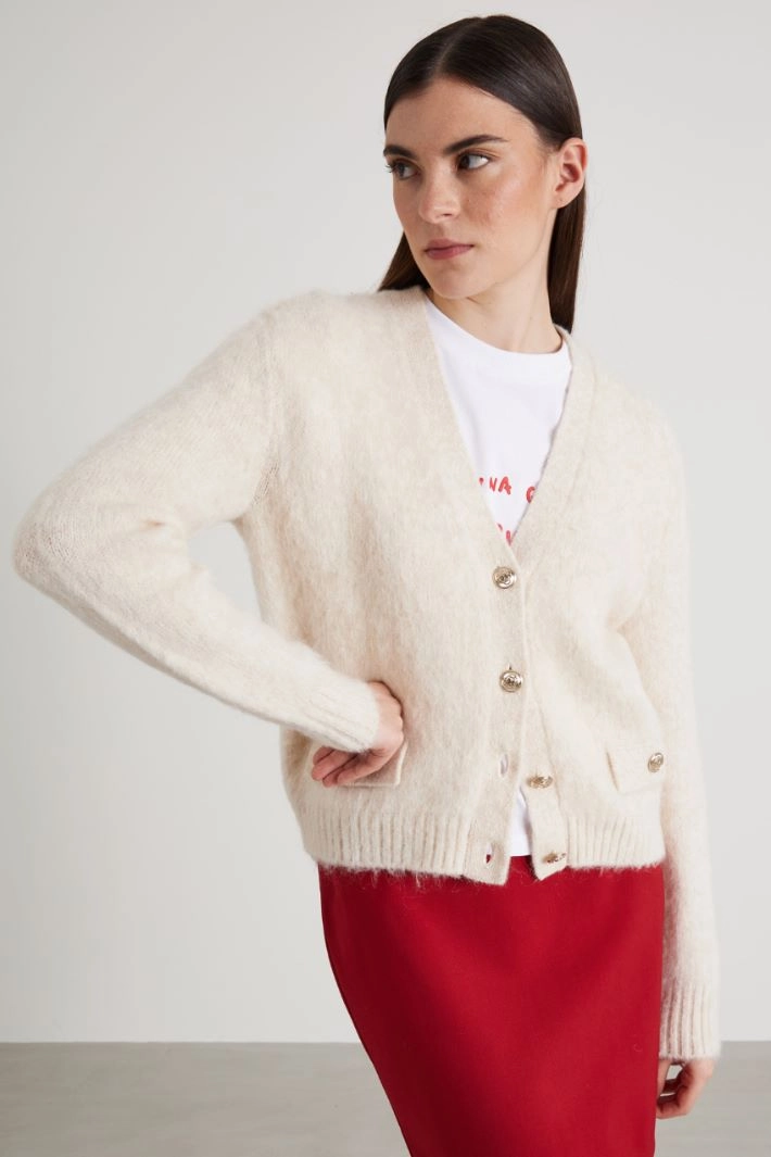Cardigan dalla linea semiaderente realizzato in filato misto mohair garzato, con scollo a V, maniche lunghe e finte tasche con patta. Allacciatura tramite bottoni.