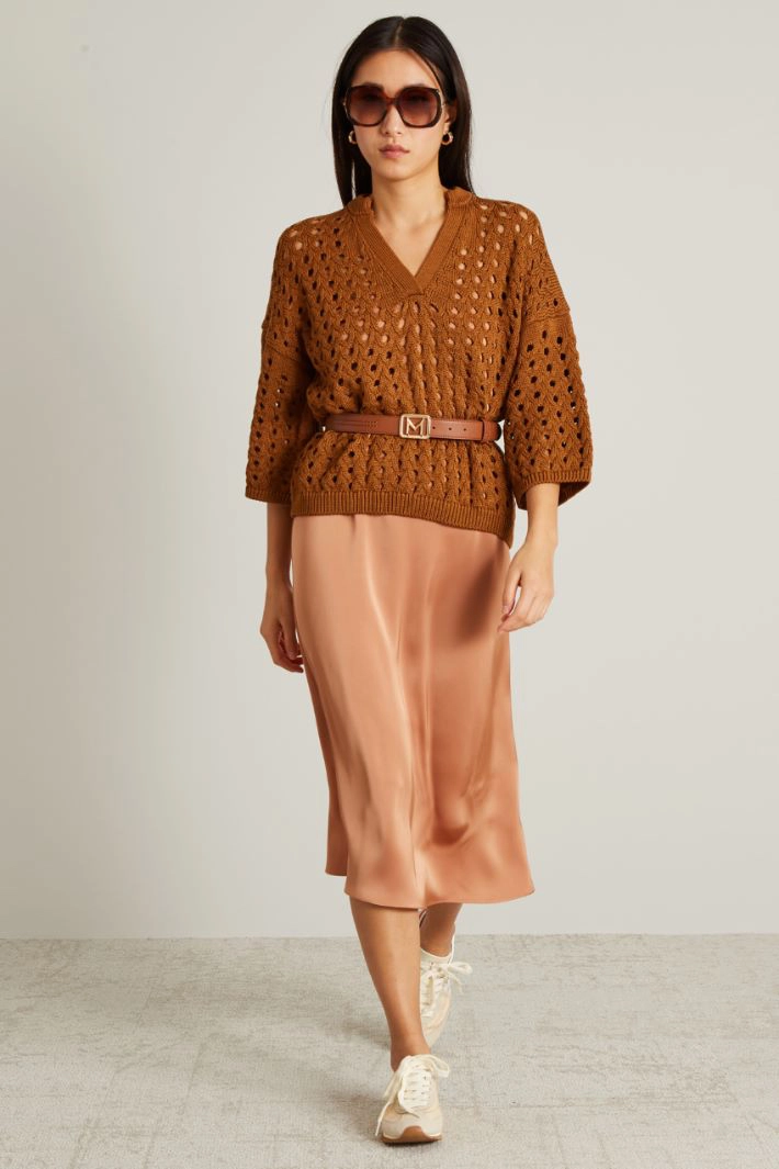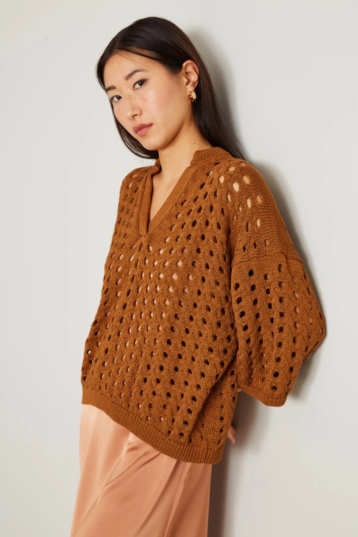 Maglia a rete dalla linea boxy realizzato in filato di puro cotone con scollo a giro e scollo a V con maniche a tre quarti ampie dal giro sceso e profili rifiniti a costine.