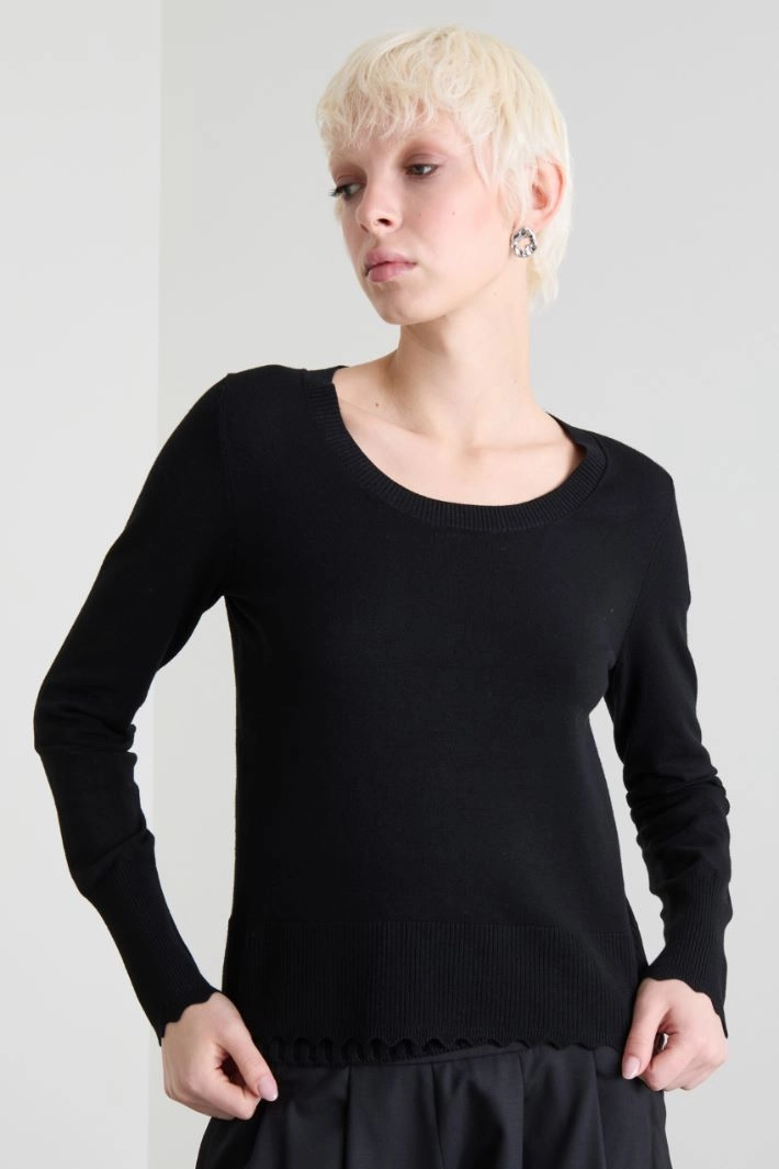Maglia dalla linea dritta realizzata in filato di misto viscosa, con scollo a U, maniche lunghe e allacciatura a goccia tramite bottone sul retro.