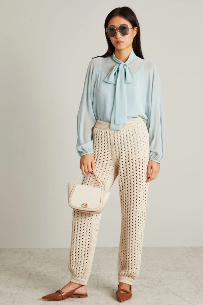 Pantaloni dalla linea jogger realizzati in maglia traforata di puro cotone, con inserto elastico in vita, polsino alla caviglia e bordi rifiniti a coste. Culotte in jersey di viscosa stretch coordinate in abbinamento.