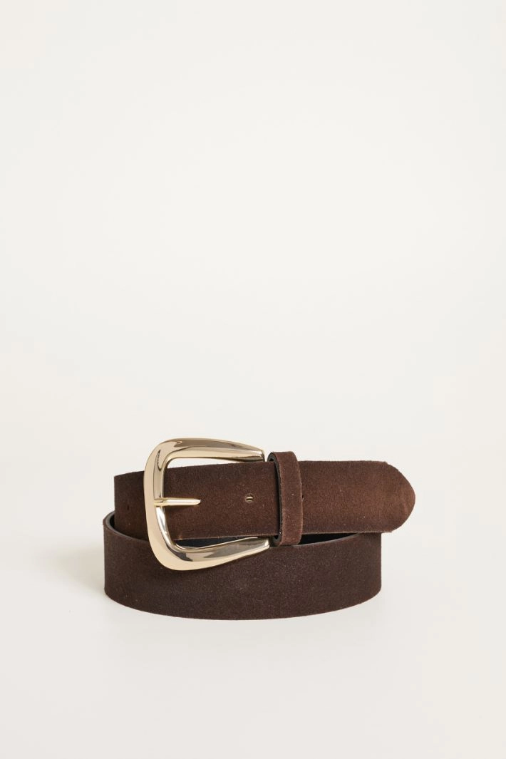 Cintura in pelle scamosciata con fibbia sagomata in metallo.