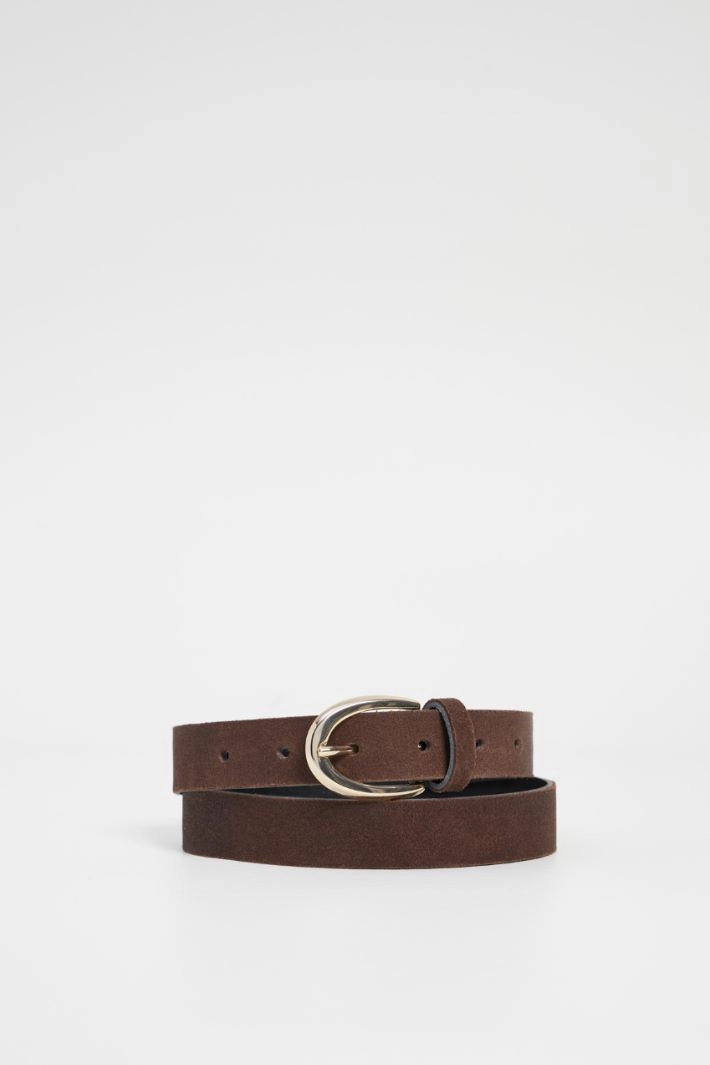Cintura sottile realizzata in vera pelle effetto suede, con passante singolo, fibbia ovale e ardiglione in metallo.
