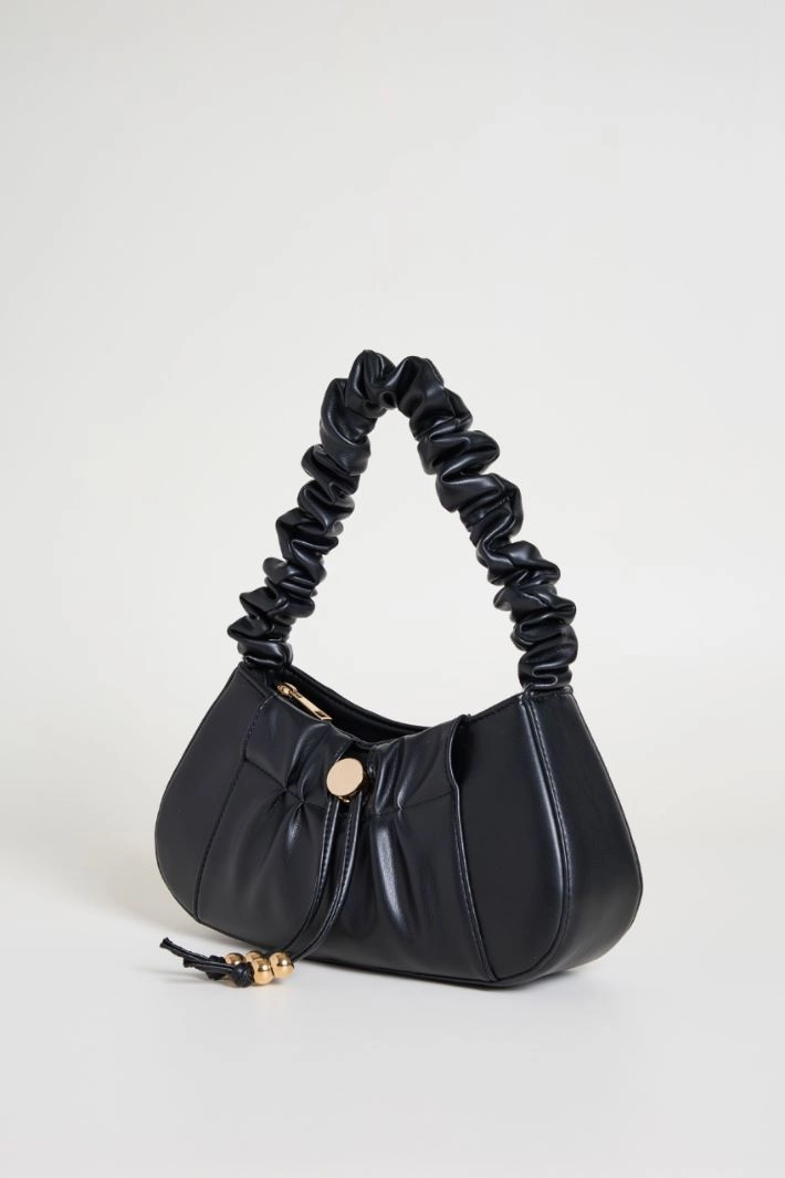 Borsa in tessuto spalmato con manico arricciato, inserto con motivo di pieghe e coulisse sul davanti. Modello foderato. Chiusura con zip.