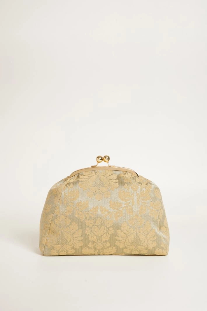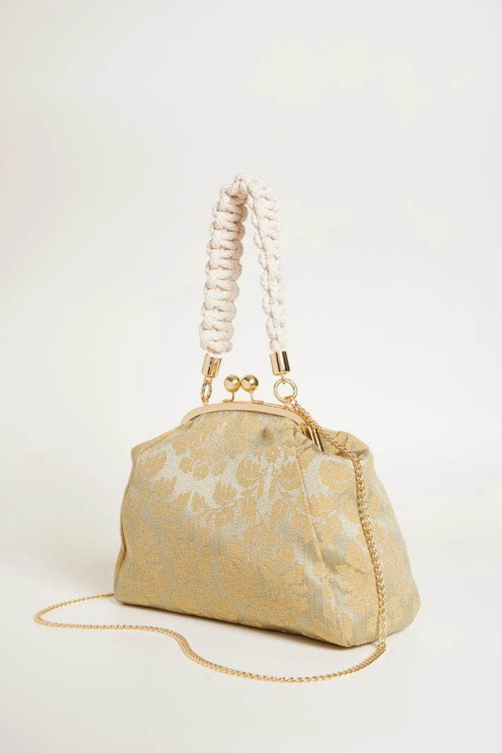 Clutch in tessuto misto cotone con motivo jacquard, manico in tessuto intrecciato e tracolla a catena rimovibili tramite moschettoni. Modello foderato. Chiusura a scatto tramite boules di metallo.