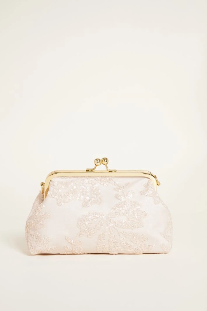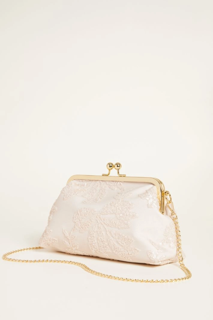 Pochette in tessuto con ricamo di paillettes e tracolla a catena rimovibile. Modello foderato. Chiusura a scatto con boules.