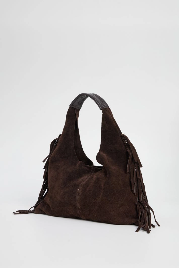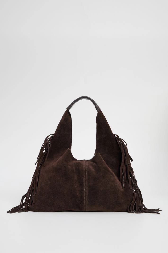 Borsa realizzata in vera pelle effetto suede, con manico singolo e dettaglio di frange laterali. Chiusura tramite bottone magnetico