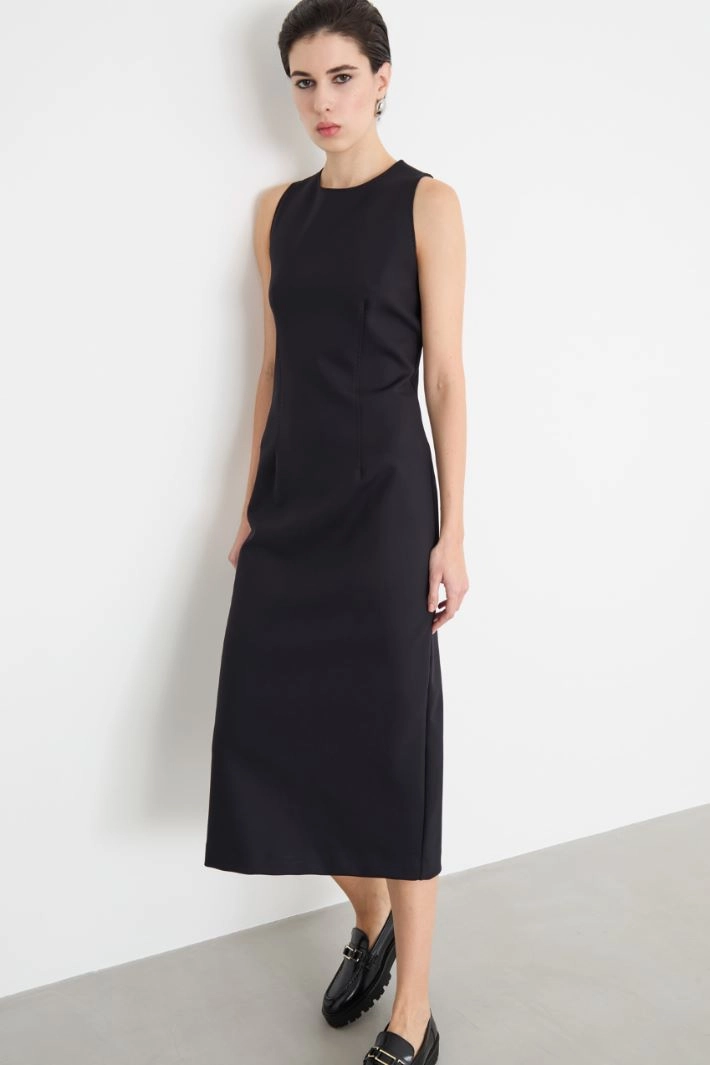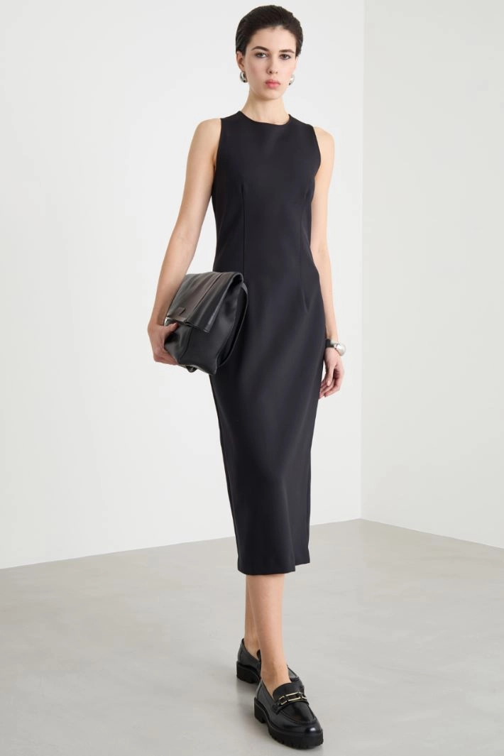Abito midi dalla linea aderente in jersey tecnico, con scollo tondo, spalline larghe, spacco sovrapposto al centro sul retro. Chiusura con zip sul retro.
