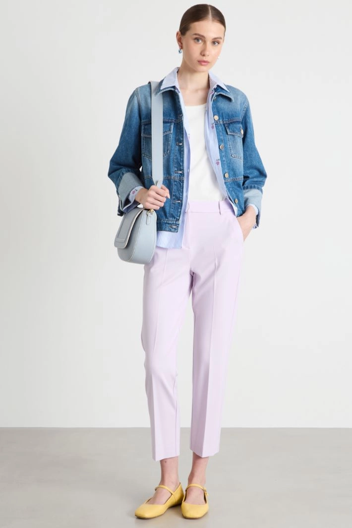Pantalone dalla linea a sigaretta in jersey misto viscosa stretch, con passanti in vita, tasche alla francese sul davanti, tasche a filetto sul retro. Chiusura con bottone e zip nascosta.
