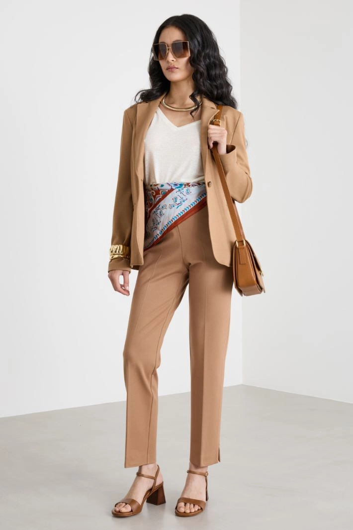 Blazer dalla linea aderente in jersey di misto viscosa stretch, con scollo a rever, maniche lunghe, tasche a filetto. Capo parzialmente foderato. Chiusura con bottone.