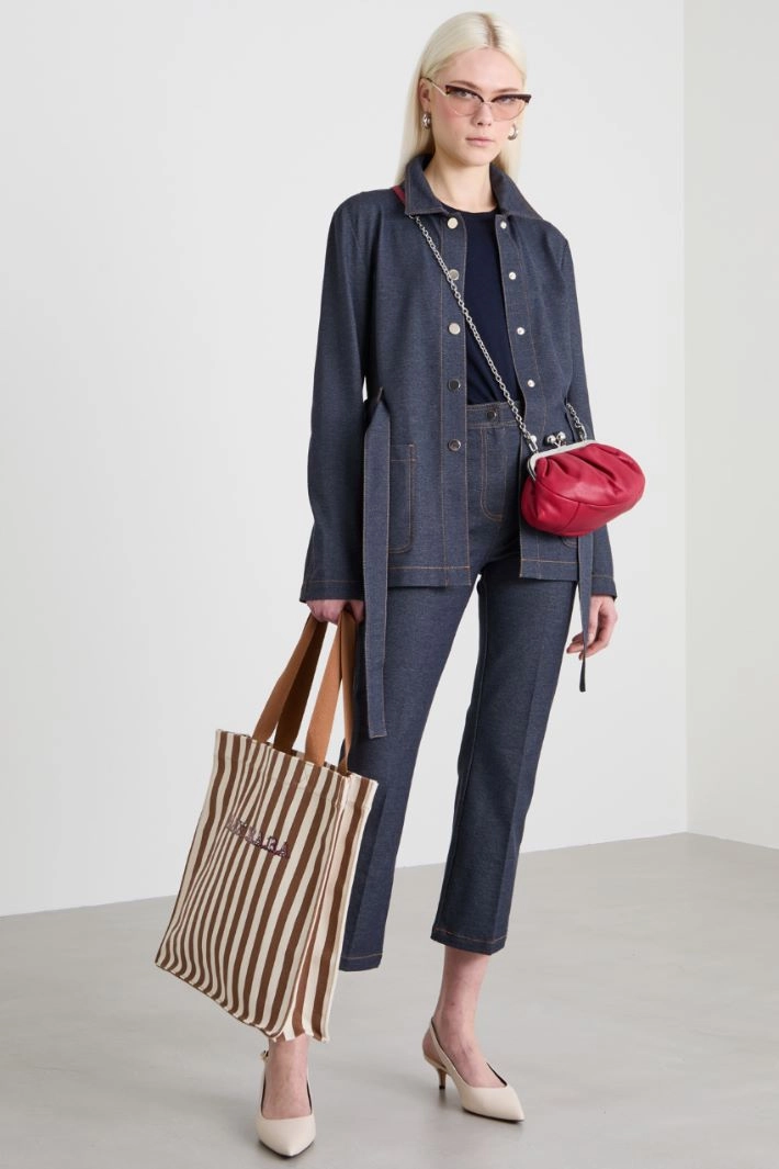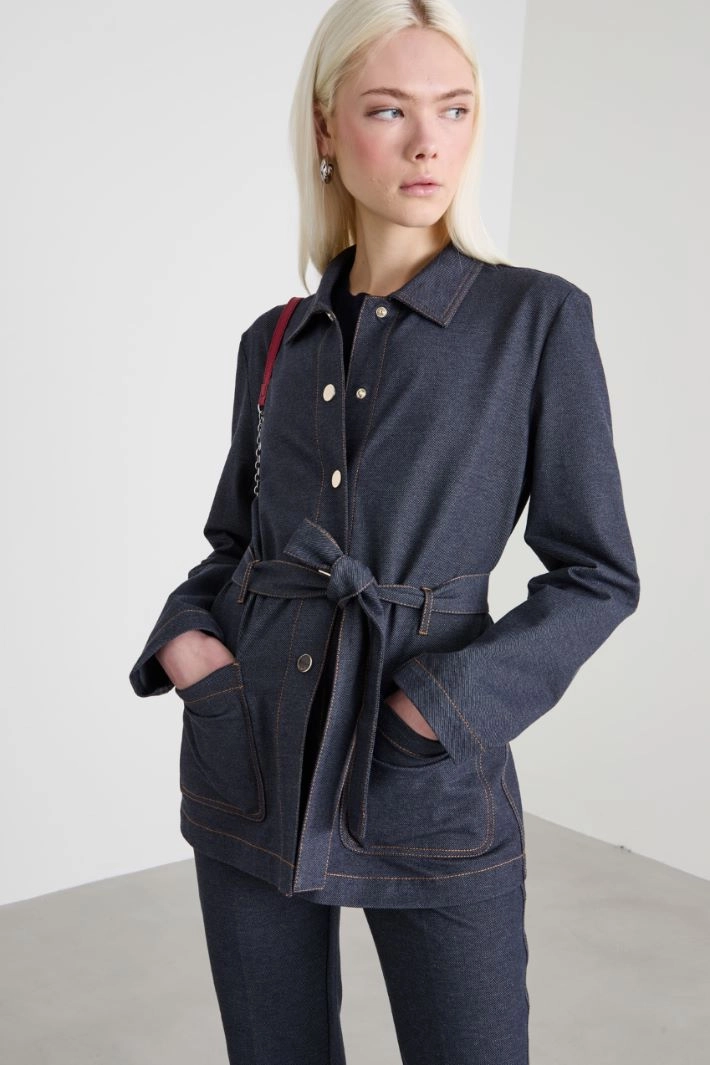 Giacca dalla linea dritta realizzata in jersey di cotone stretch effetto denim, con colletto a camicia, maniche lunghe, tasche laterali applicate e allacciatura monopetto tramite bottoni. Cintura coordinata in abbinamento. Capo sfoderato.