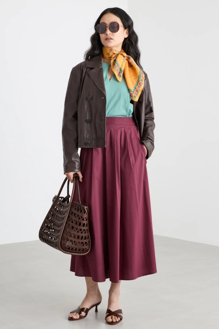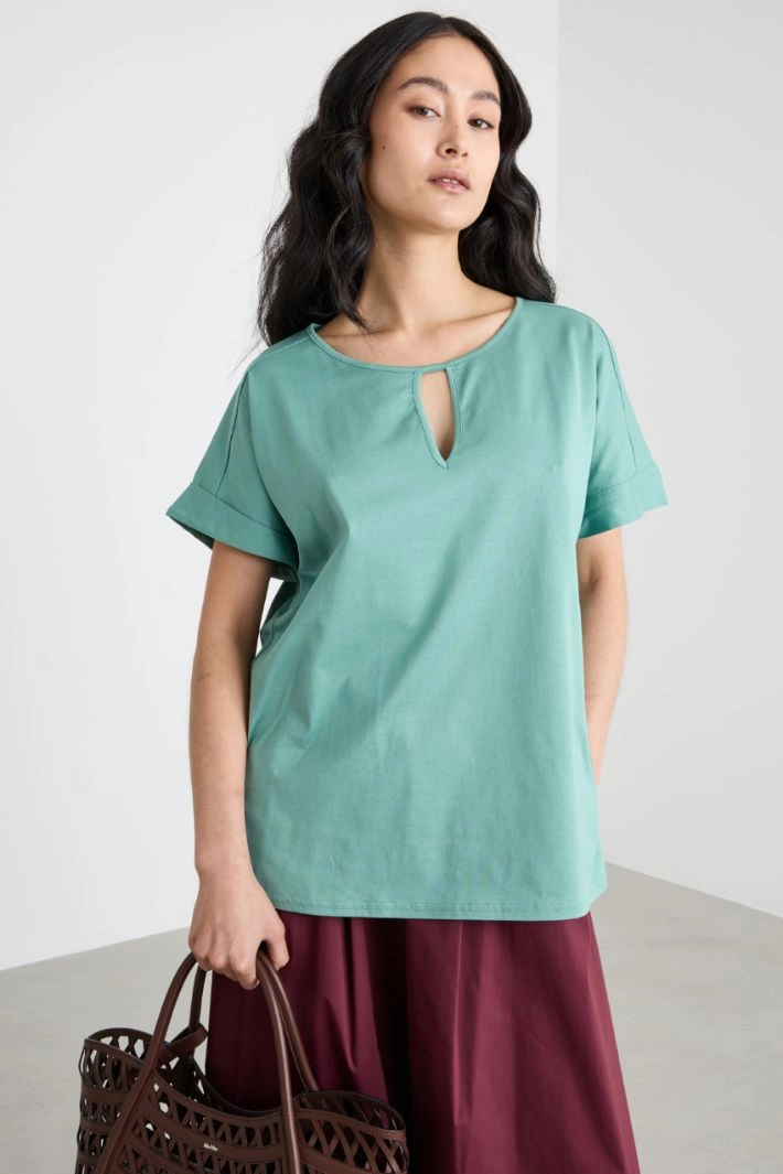 T-shirt dalla linea dritta in jersey di cotone, con scollo tondo e dettaglio cut-out sul davanti, maniche corte a kimono con risvolto, motivo a intarsio sulle spalle e spacchi laterali al fondo.