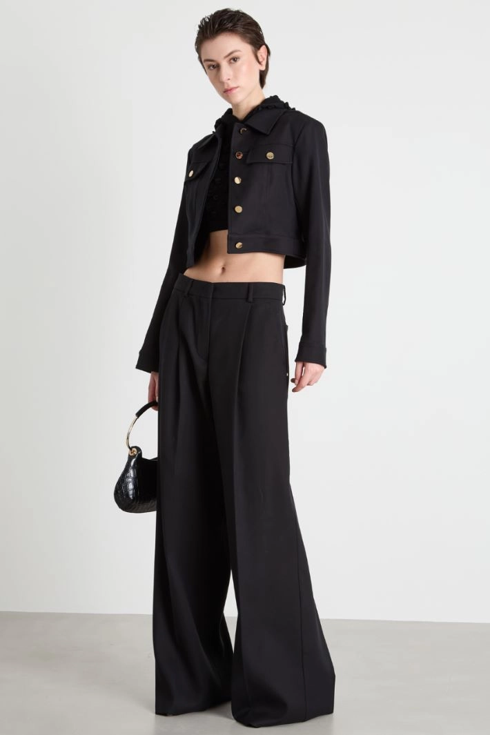 Giacca crop dalla linea boxy in doppio cady di cotone e viscosa, con colletto a punta, maniche lunghe, tasche applicate sul petto con patta e bottoni metallici. Alamari posteriori. Chiusura con bottoni.