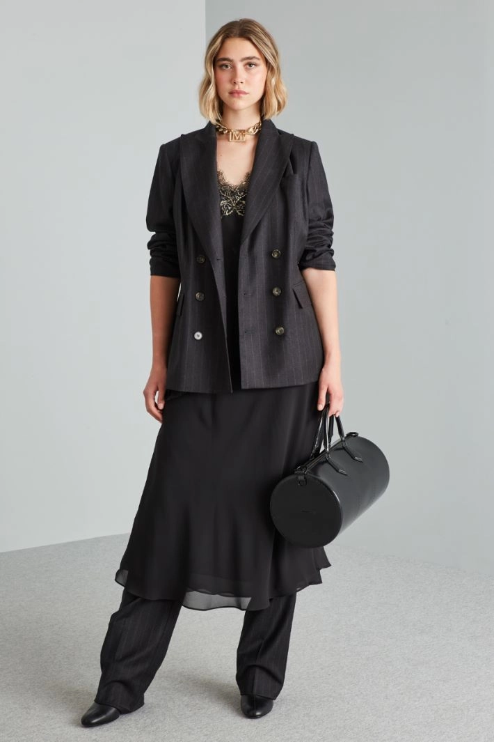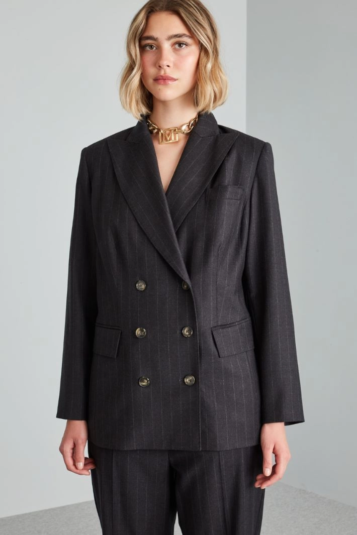 Blazer dalla linea leggermente sfiancata realizzato in flanella gessata di lana stretch tinto filo, con collo a rever, maniche lunghe, taschino a filetto al petto e a doppio filetto con patta sui fianchi, motivo di occhielli sagomati nel retro. Allacciatura doppiopetto tramite bottoni. Capo foderato.