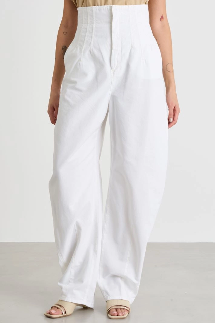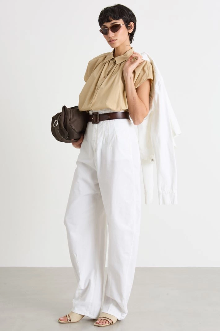 Pantalone dalla linea balloon a vita alta in tela di cotone, con pinces impunturate sul davanti e il retro della vita, tasche inserite in cucitura, tasche posteriori applicate. Chiusura con zip e gancio.