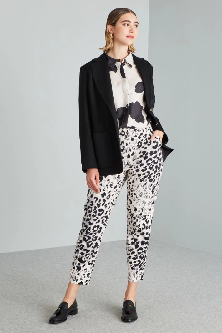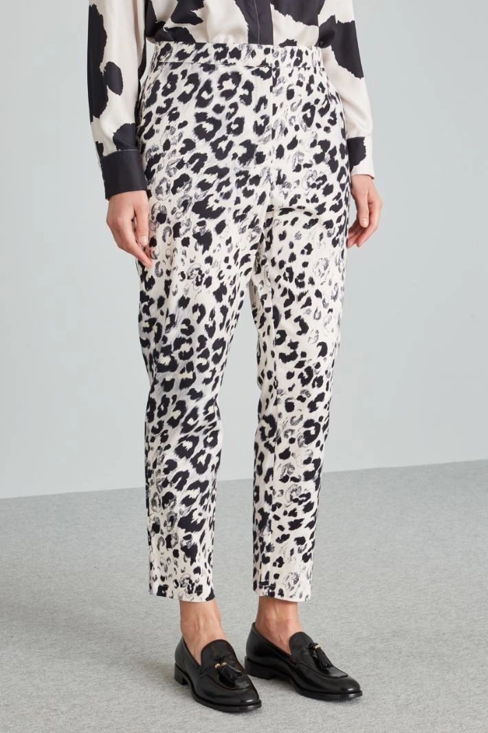 Pantaloni dalla linea slim realizzato in drill di cotone stretch stampato, con tasche laterali alla francese e a filetto nel retro, allacciatura nascosta tramite zip, bottone e gancio.