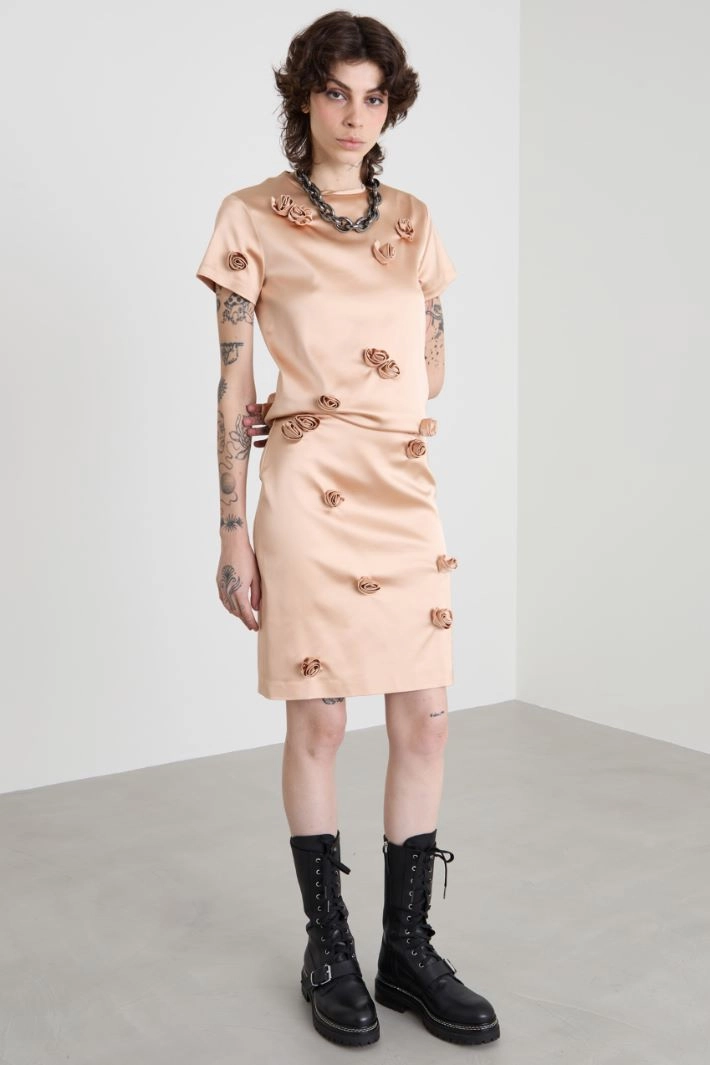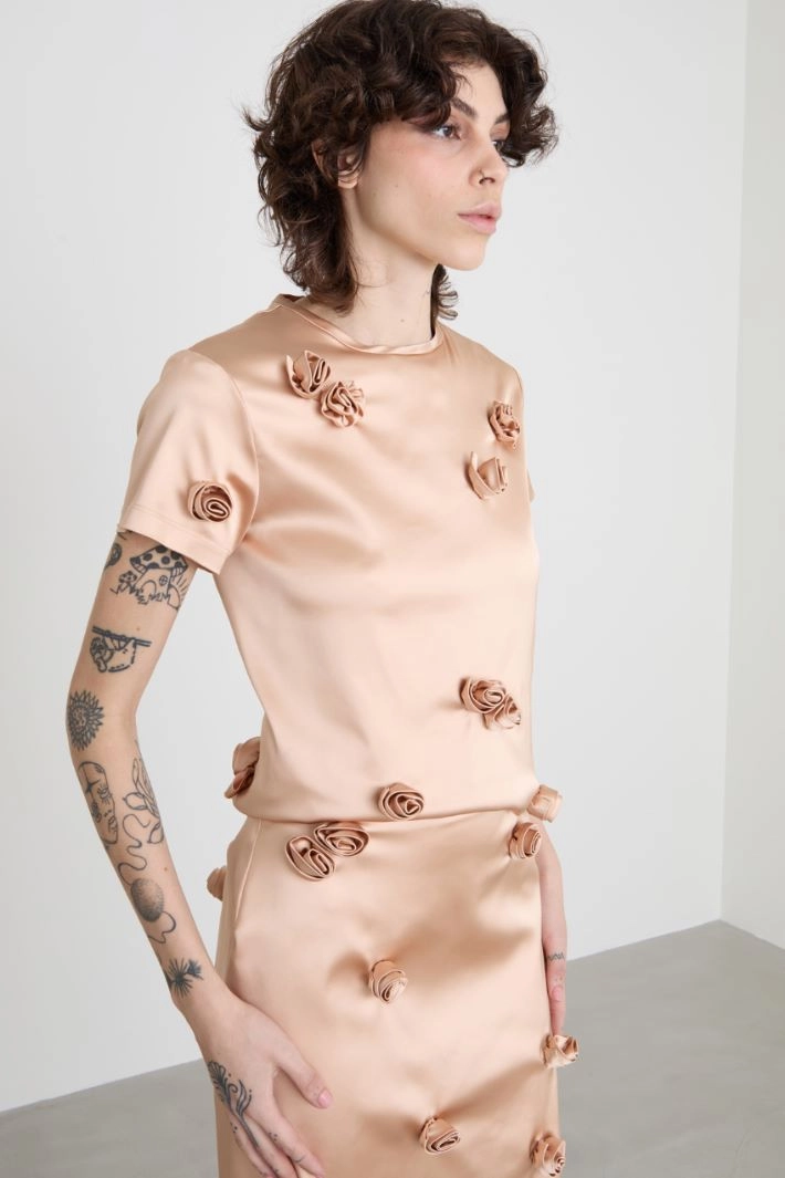 Top dalla linea semiaderente realizzato in raso pesante stretch, con rose ricamate all over in tono, scollo a giro, maniche corte e allacciatura tramite zip invisibile sul retro.