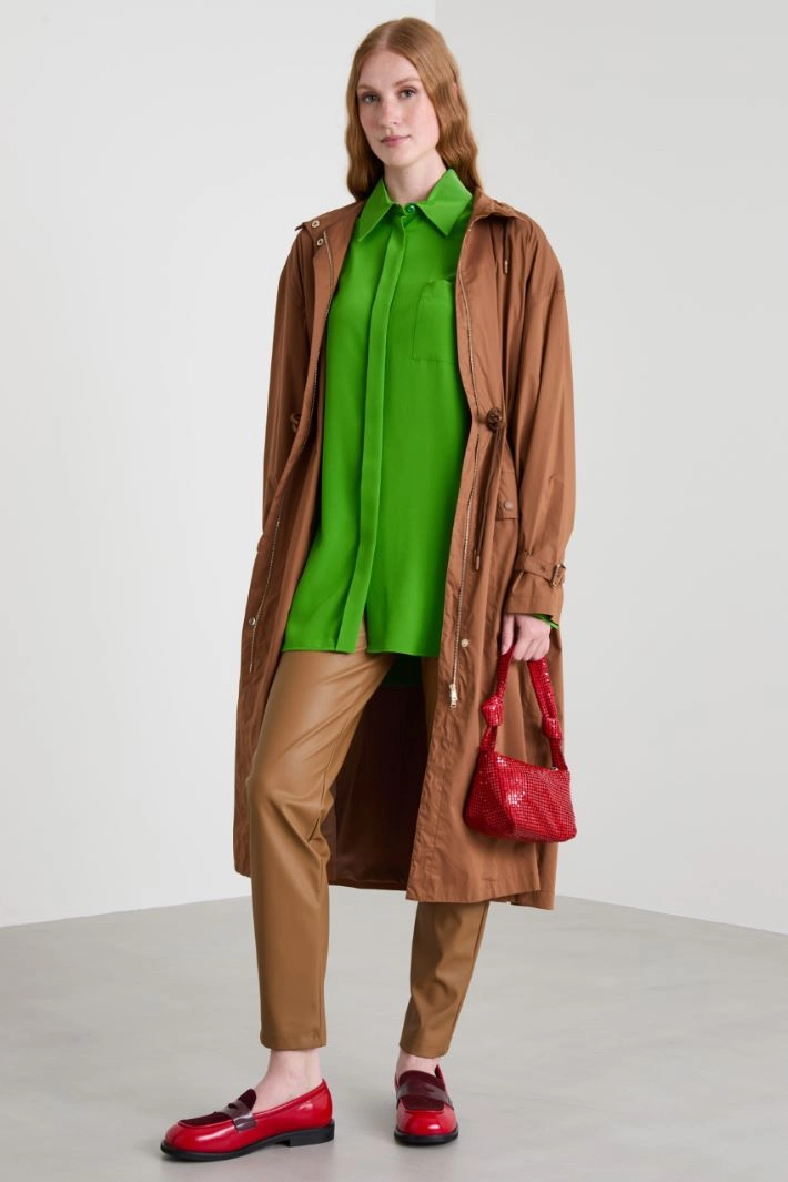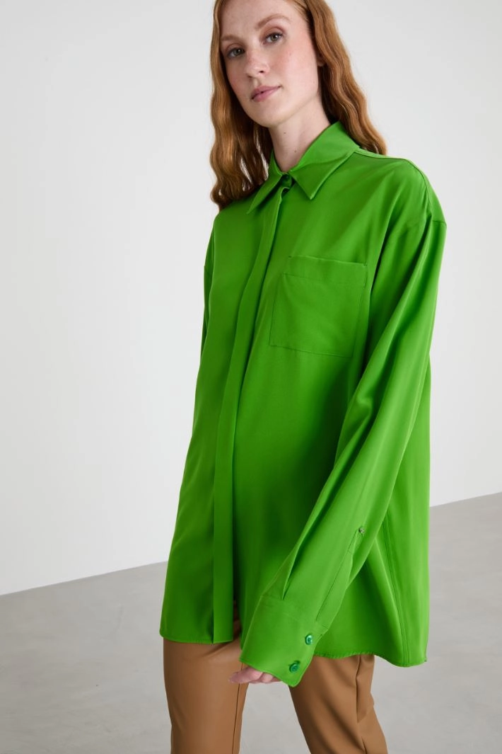 Camicia dalla linea over realizzata in crépe de chine di pura seta, con colletto classico, maniche lunghe con polsino e bottoni, taschino applicato al petto e taglio carrè con cannoncino nel retro. Allacciatura nascosta tramite bottoni.
