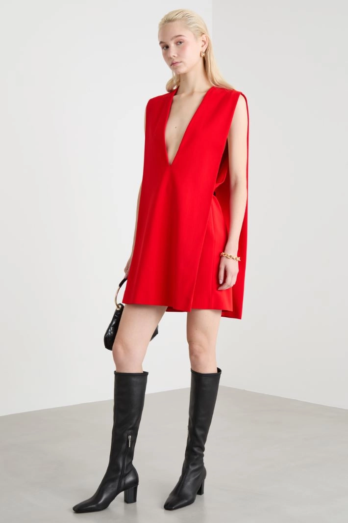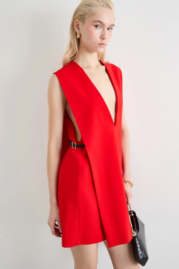 Abito corto dalla linea dritta in viscosa stretch, con scollo a V profondo e taglio smanicato, effetto maxi gilet con retro asimmetrico più lungo.