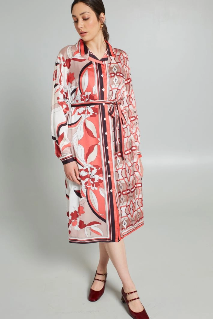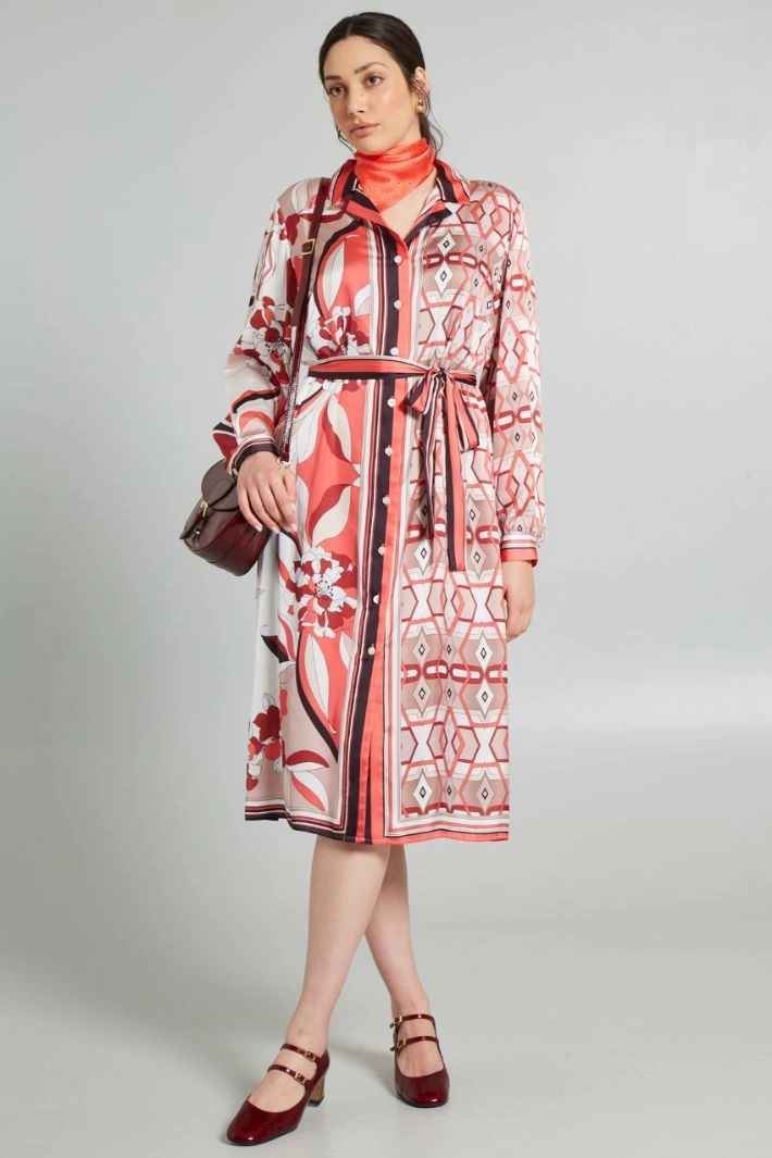 Abito dalla linea chemisier realizzato in raso stampato, con collo a revers e maniche lunghe con polsino e bottoni. Allacciatura tramite cintura in abbinamento e bottoni. Con sottoveste.