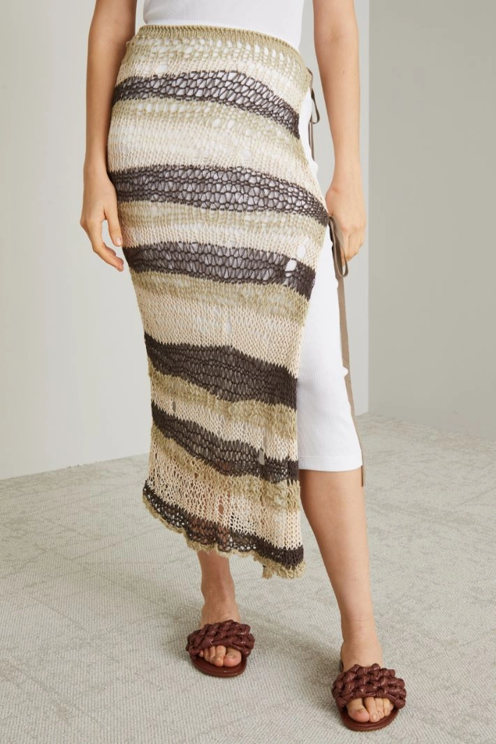 Gonna in maglia filato in maglia 1 100% cotone; filato in maglia 2 74% cotone, 26% poliammide; filato in maglia 3 55% iuta, 35% cotone, 10% poliammide. Gonna in jersey 65% cotone, 31% seta, 4% elastan.