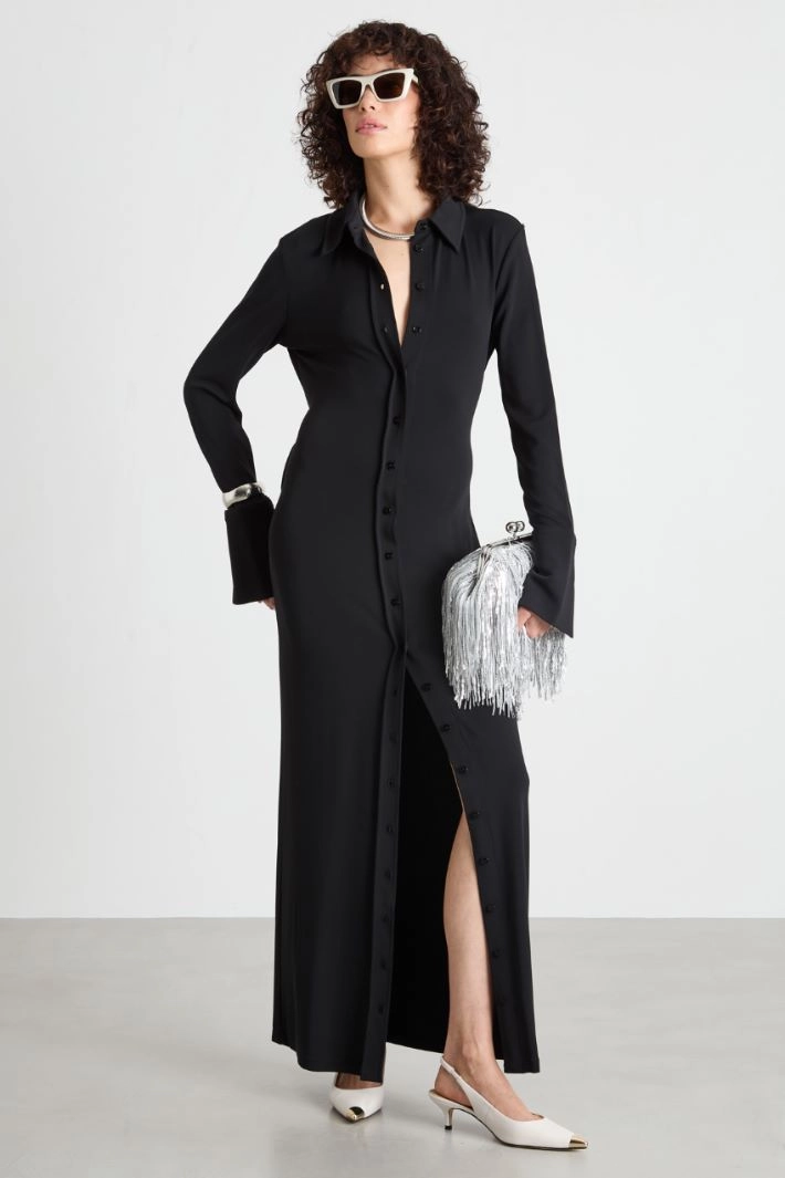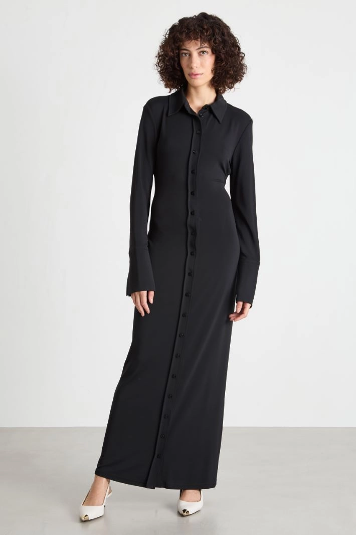 Abito chemisier lungo dalla linea aderente in jersey crepe, con colletto a punta, maniche lunghe con polso a doppia altezza con bottone, apertura sulla schiena con costruzione incrociata. Chiusura con bottoni.