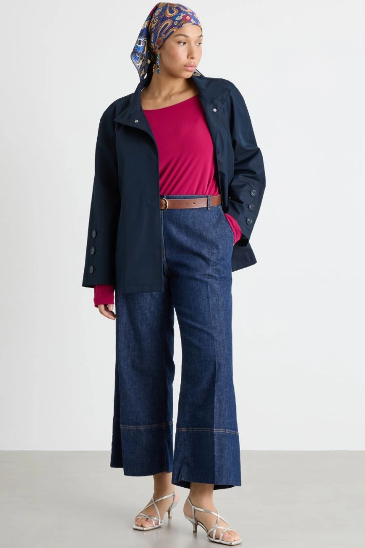Cappa impermeabile dalla linea svasata in misto cotone, con colletto a listino, maniche lunghe raglan con bottoni ricoperti, tasche a filettone. Capo foderato. Chiusura con bottoni.