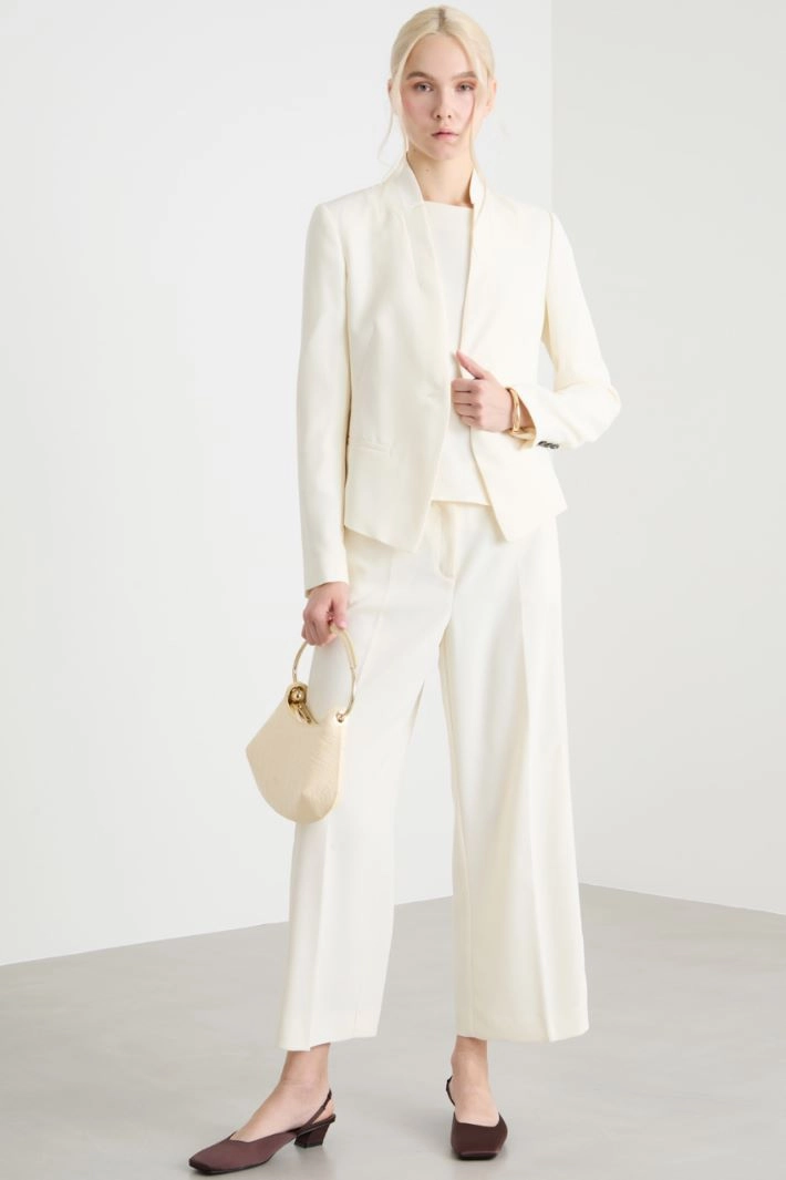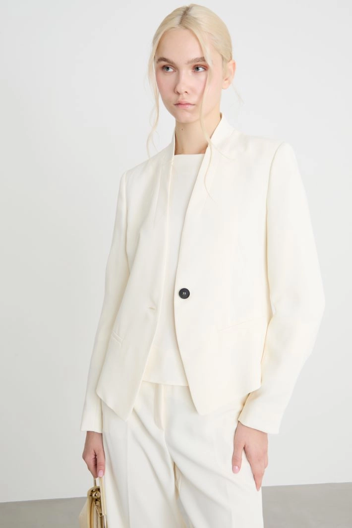 Blazer dalla linea aderente in raso dal finish opaco, con collo montante, maniche lunghe, tasche a filetto. Capo foderato. Chiusura con bottone.
