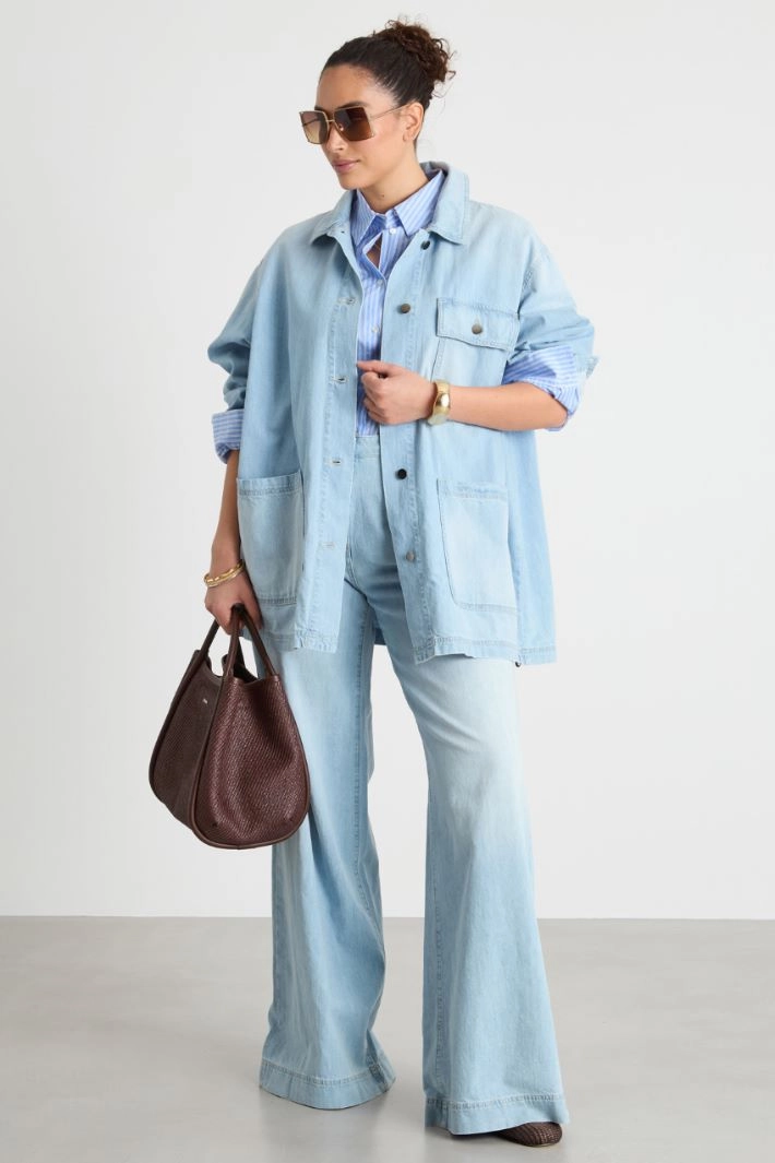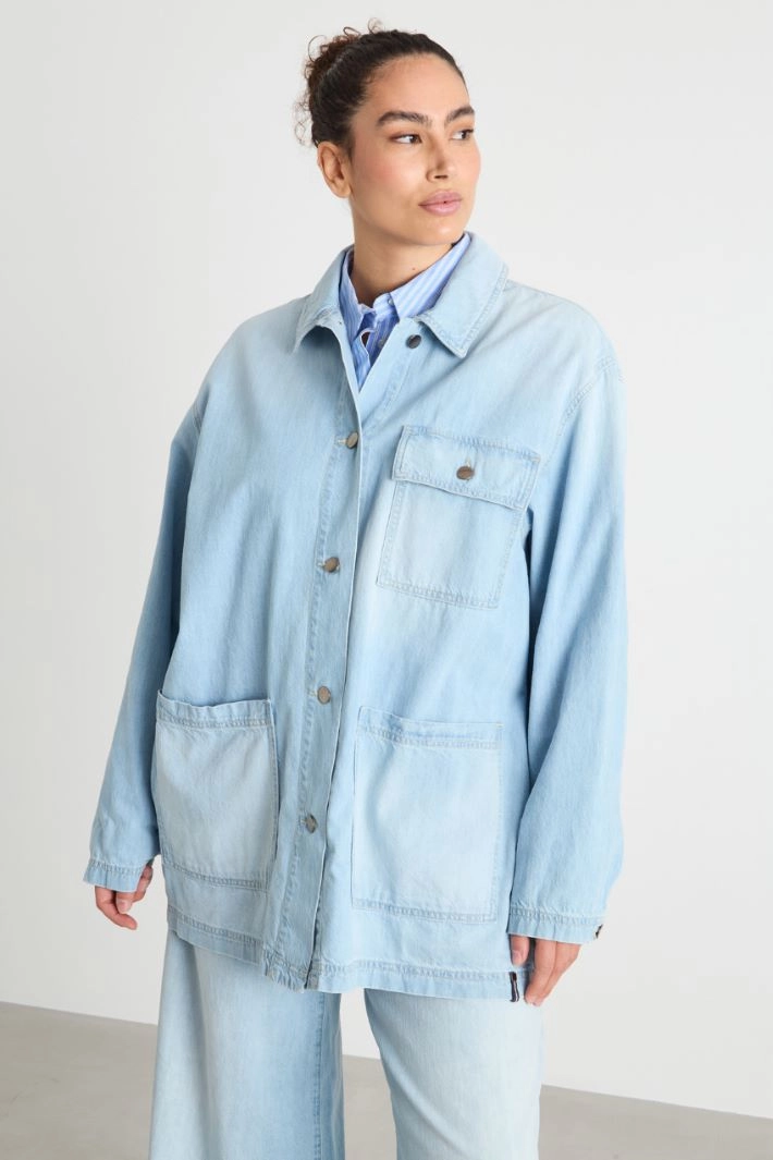 Giacca dalla linea dritta in jeans, con colletto a punta, tasca sul petto con patta e bottone, maniche lunghe, tasche applicate sul basso. Chiusura con bottoni.