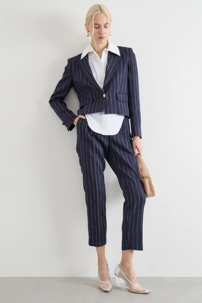 Blazer crop dalla linea dritta in tessuto natté stretch, con scollo a rever, maniche lunghe, tasche applicate, spacco posteriore. Capo foderato. Chiusura con bottone.