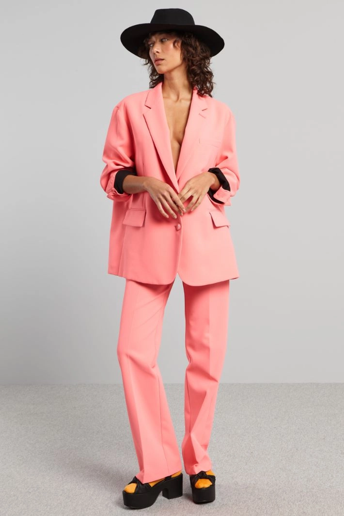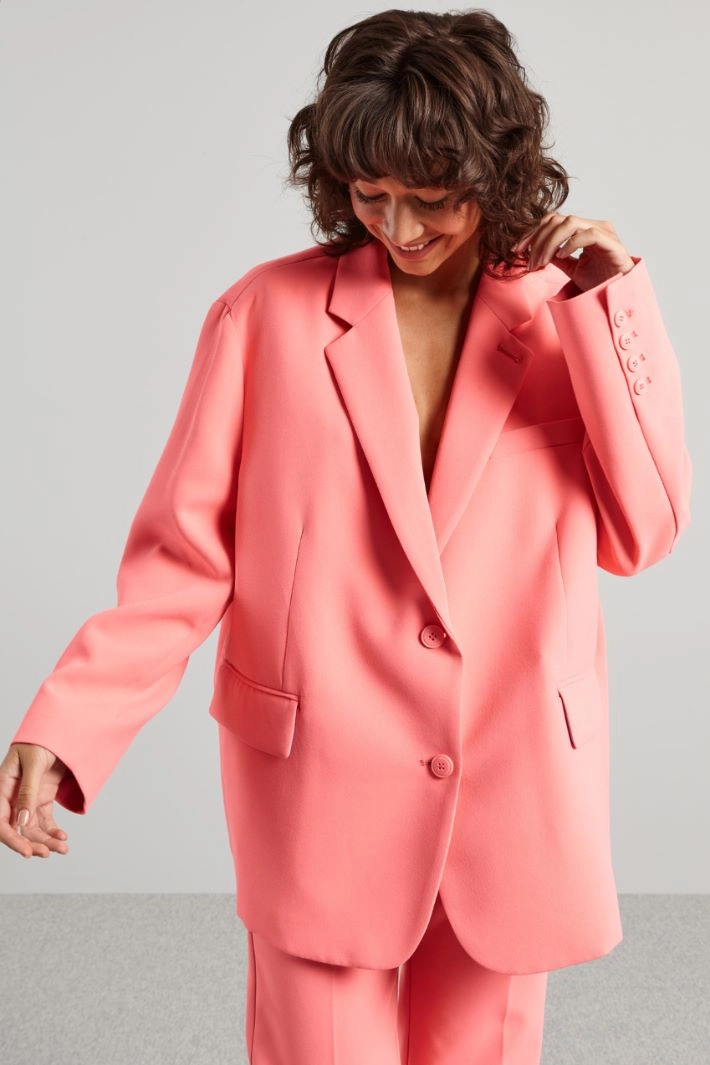 Blazer dalla linea over realizzato in cady pesante, con collo a rever, maniche lunghe con bottoni, taschino a filettone e tasche a doppio filetto con patta. Allacciatura monopetto tramite bottoni. Sfoderato.