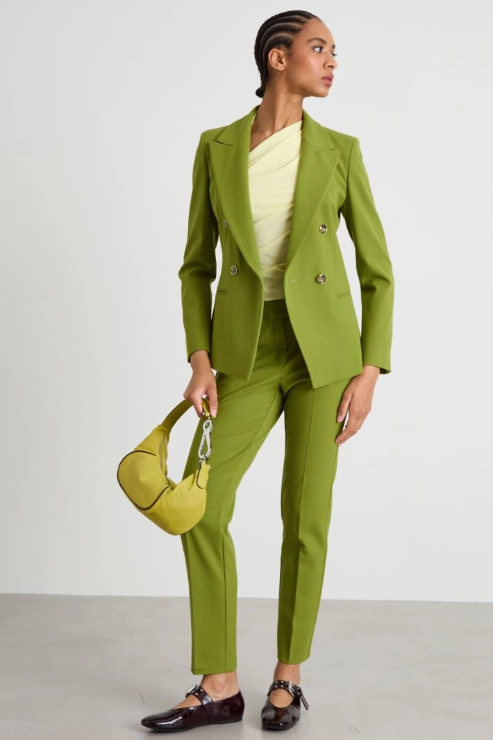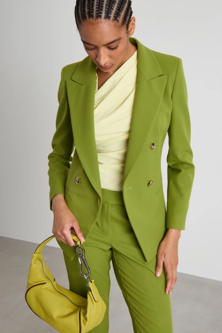 Blazer dalla linea sfiancata realizzato in gabardina misto viscosa stretch, con collo rever a lancia, maniche lunghe con bottoni e tasche a doppio filetto. Allacciatura doppiopetto tramite bottoni. Capo foderato.